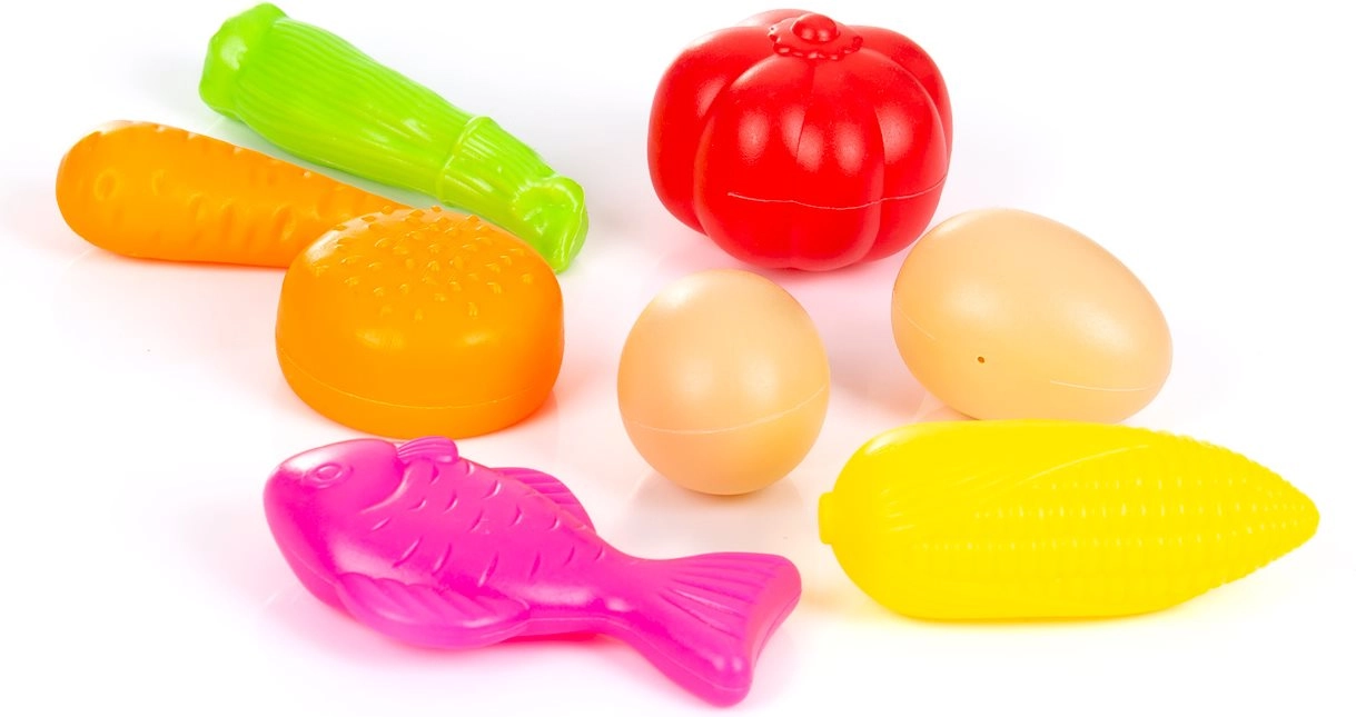 Sada obsahuje realistické makety ovoce a zeleniny v jasných barvách, které pomáhají s rozeznáváním tvarů a podporují kreativní role-play.