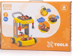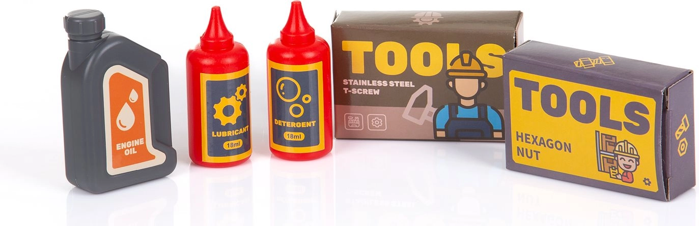 Součástí jsou dětské nástroje a spojovací díly pro šroubování, montování a procvičování zručnosti a představivosti.