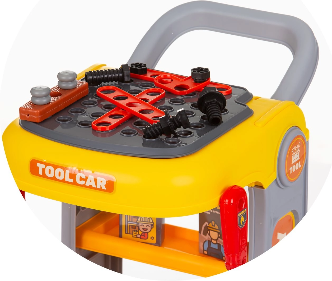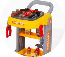 Snadné přesouvání díky pevnému madlu a kolečkům. Děti si mohou vzít svou dílnu kamkoli a mít nářadí stále po ruce.