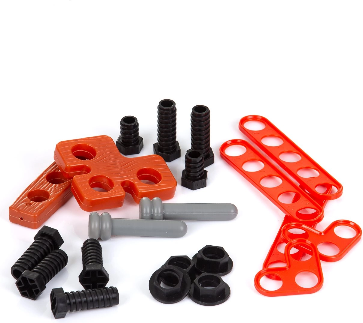Horní deska s otvory a praktické přihrádky udrží všechny díly přehledně. Ideální pro malé projekty a učení se pořádku.
