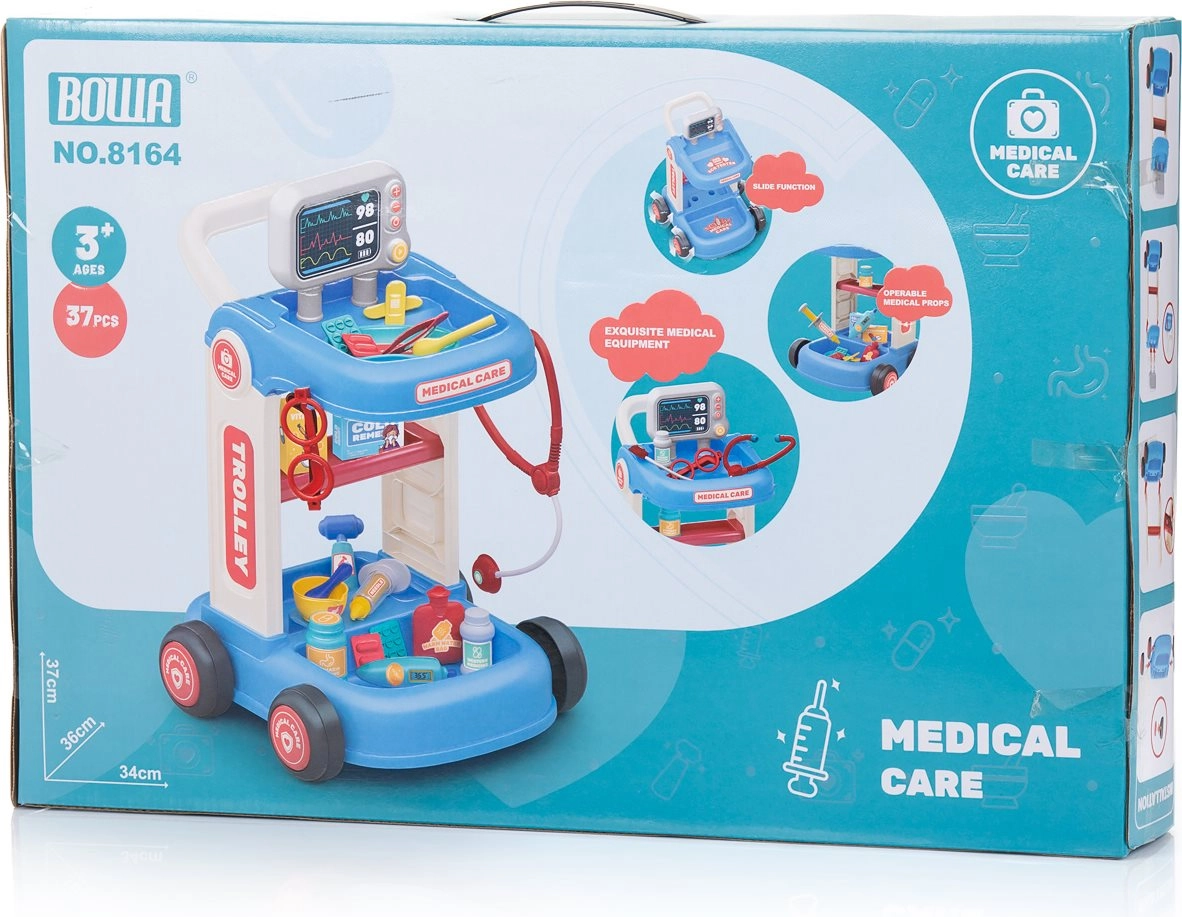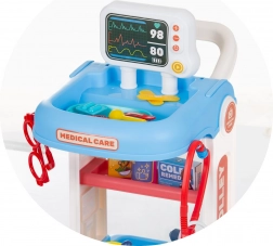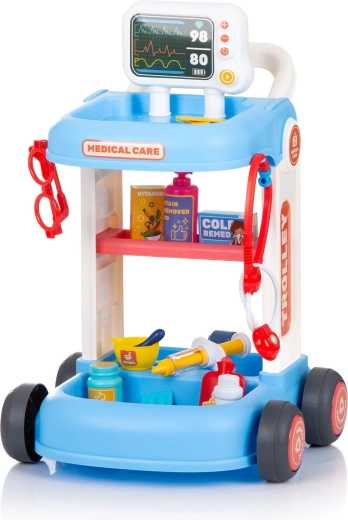 Tento dětský lékařský set s pojízdným vozíkem nabízí vše, co malý doktor potřebuje pro své první vyšetření. Stabilní konstrukce s kolečky a madlem umožňuje snadné přesouvání po místnosti, zatímco police a přihrádky udrží všechny nástroje přehledně po ruce. Díky bohaté výbavě si děti mohou vyzkoušet základní lékařské úkony a procvičit empatii i komunikační dovednosti.