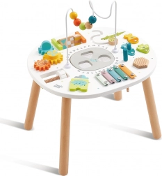 Tento robustní aktivní stolek je vyroben z kvalitního dřeva a doplněn kovovými, textilními a plstěnými prvky pro pestrý multisenzorický prožitek. Jemné barvy a přátelský design podporují fantazii a přirozené učení formou hry. Stabilní konstrukce zajistí bezpečné hraní pro děti od 18 měsíců.