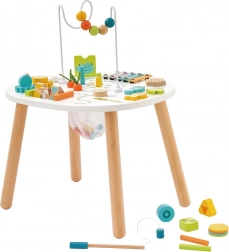 Na desce stolu děti objeví rozmanité stanice: drátěný korálkový labyrint, xylofon s paličkou, otáčecí ozubená kolečka, magnetickou rybolovnou hru, vkládačku tvarů a další chytré prvky pro trénink logiky, trpělivosti a koordinace. Díky více aktivitám na jednom místě zůstane herní kout přehledný a děti se snadno soustředí.