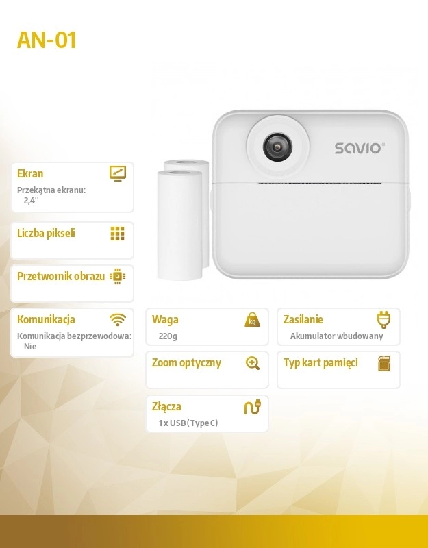 Dětský fotoaparát SAVIO AN‑01 kombinuje jednoduché ovládání s bohatou výbavou pro kreativní zábavu. Termální tisk umožňuje okamžité vytištění černobílých snímků bez nákladů na inkoust. Širokoúhlý objektiv se zorným úhlem 90° a rozlišení až 48 MP zajistí ostré a detailní fotografie i videa.