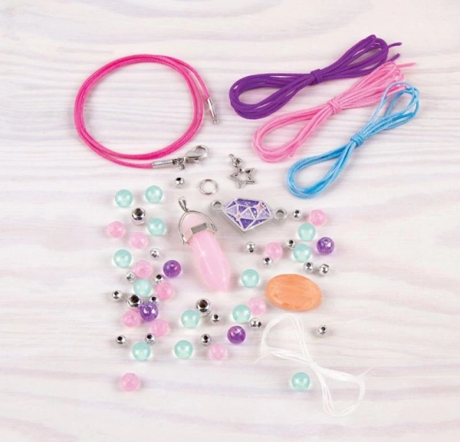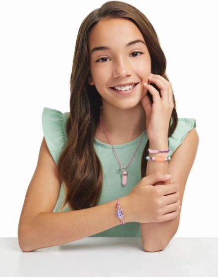 Součástí jsou korálky připomínající krystaly, barevné perličky a příjemné šňůrky s možností nastavení velikosti. Tvoření je zábavné doma i na cestách a hotové doplňky se pohodlně nosí každý den.