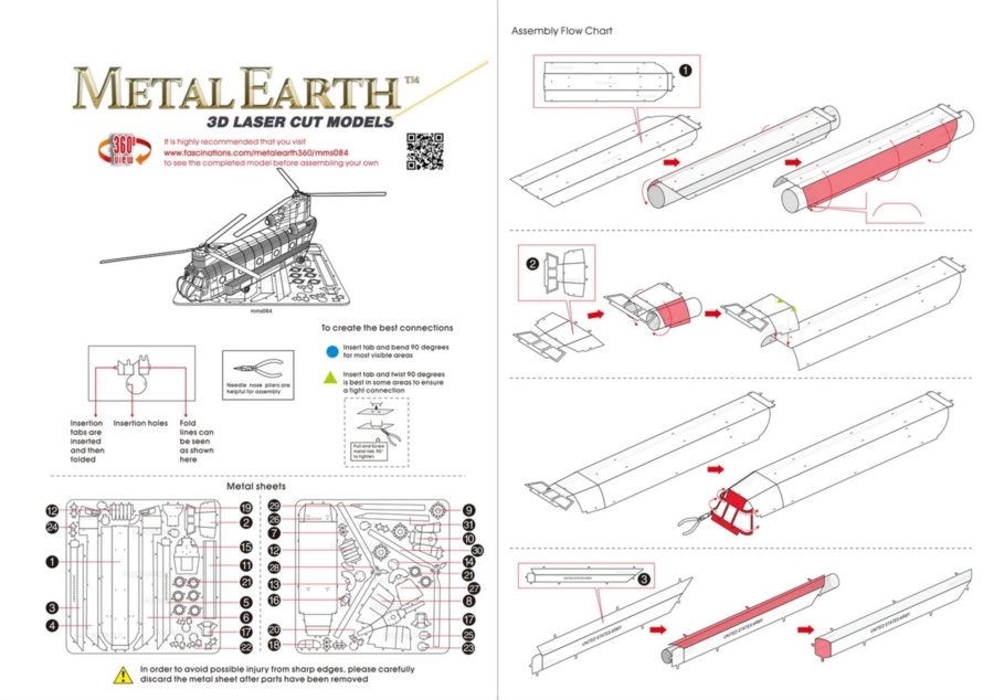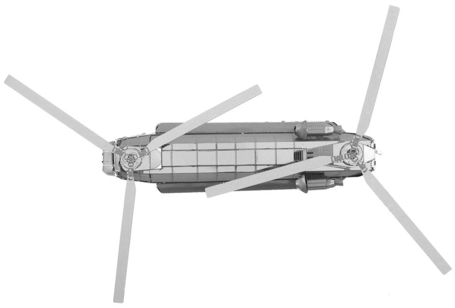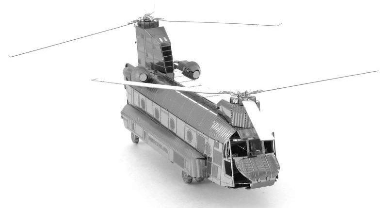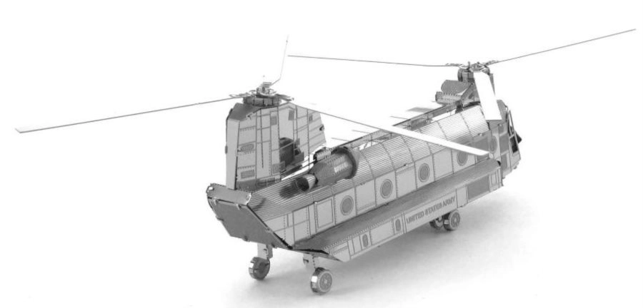 Model z řady METAL EARTH se skládá z ocelových plátků 11 × 11 cm s precizně vyřezanými dílky. Díky laserovému gravírování vyniká povrch realistickými detaily od panelových linií až po okna kabiny a tandemové rotory, typické pro CH-47 CHINOOK.