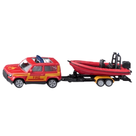 Důraz na detaily zajišťuje věrnost skutečnému vozidlu: průhledné střešní okno, realistická přední a zadní světla i rezervní kolo na zádi. Přívěs s kovovým rámem nese plastový motorový člun, který dotváří autentický vzhled a rozšiřuje možnosti hry na záchranné operace.