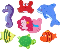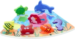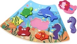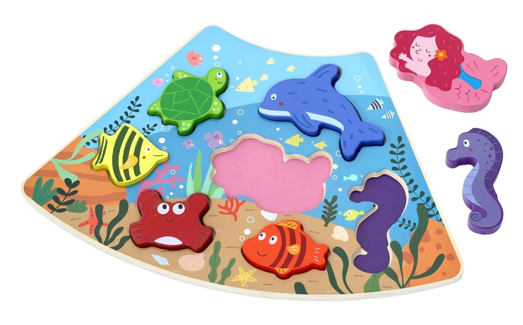 Objevte kouzlo oceánu s robustní dřevěnou podložkou a 7 různými dílky – želva, delfín, mořská panna, mořský koník, krab a další rybky. Díky silným a hladkým dílkům se puzzle skvěle drží i nejmenším dětem a pomáhá jim trénovat vnímání tvarů a trpělivost.