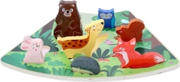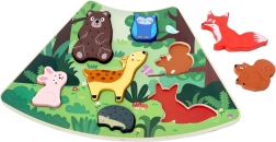Silné dřevěné dílky a přesné výřezy učí děti správnému úchopu, koordinaci oko–ruka a rozpoznávání tvarů i zvířat.