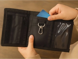 Zipová kapsa na mince, přihrádka na bankovky, průhledné okénko na průkaz a háček/karabina na klíče zajistí pořádek a rychlý přístup.
