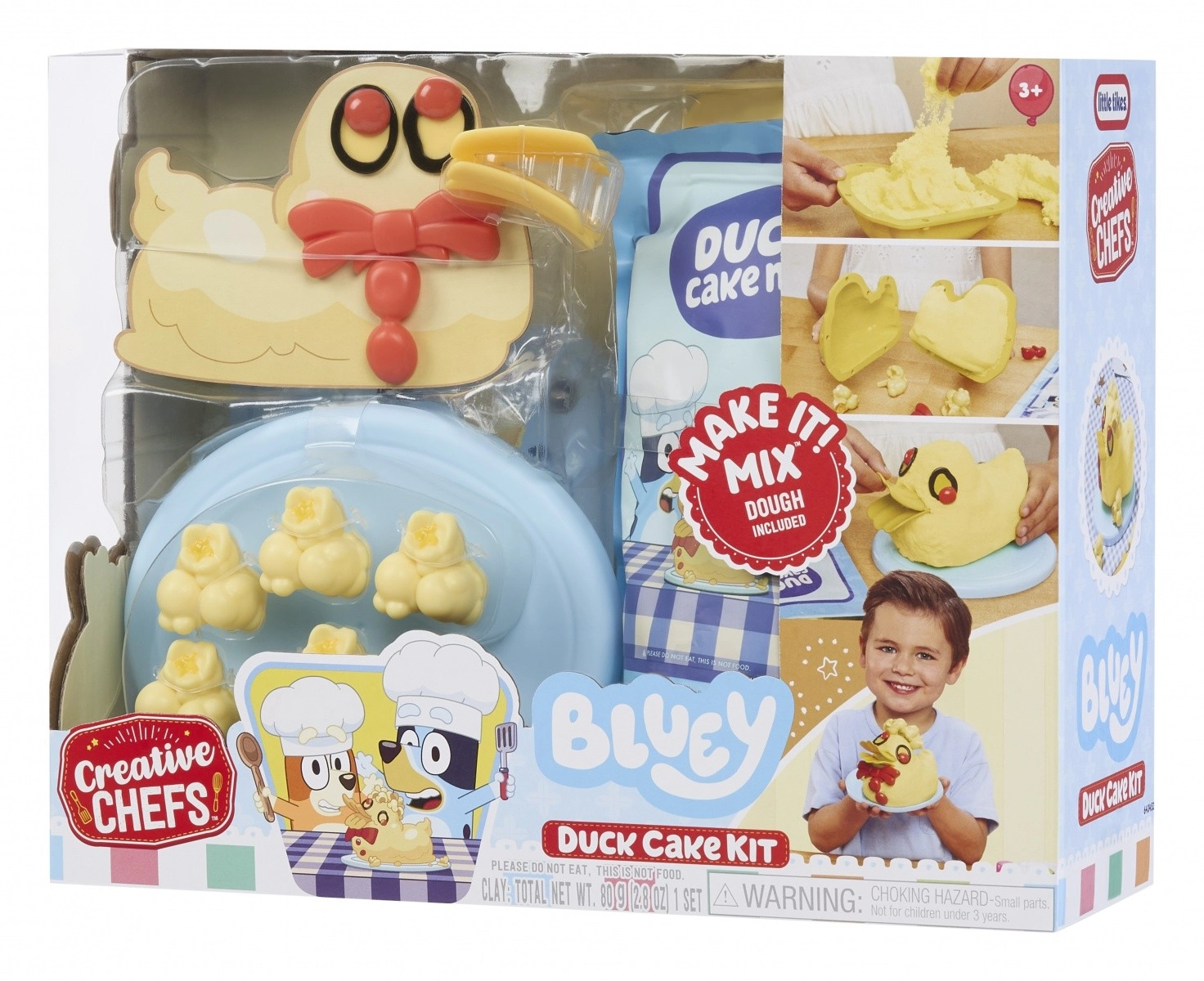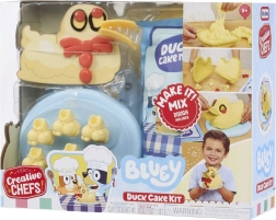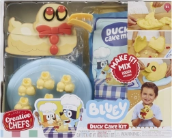 Sada CREATIVE CHEFS BLUEY – Dort „Kachnička“ přináší dětem hodiny zábavy a rozvíjí jejich představivost. Obsahuje 15 realistických kuchyňských doplňků, formu ve tvaru kachničky a formovatelnou hmotu Make It! Mix. Součástí je také obrazový recept, který učí děti postupovat podle jednoduchých instrukcí a podporuje kreativní hru a role-play.