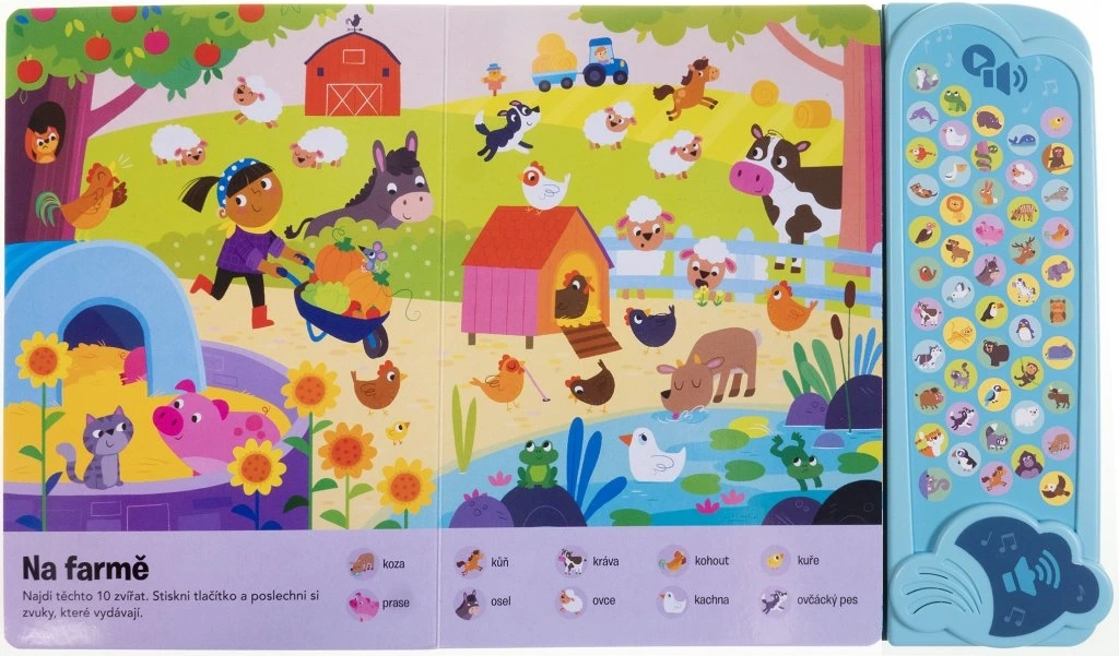 Tato krásně ilustrovaná zvuková kniha provede děti napříč rozmanitými prostředími – od klidné farmy přes hluboký les až po exotickou džungli, safari a ledové póly. Stačí najít zvířátko na stránce, stisknout příslušné tlačítko a ozve se jeho autentický zvuk. Ideální pro společné čtení i samostatné objevování.