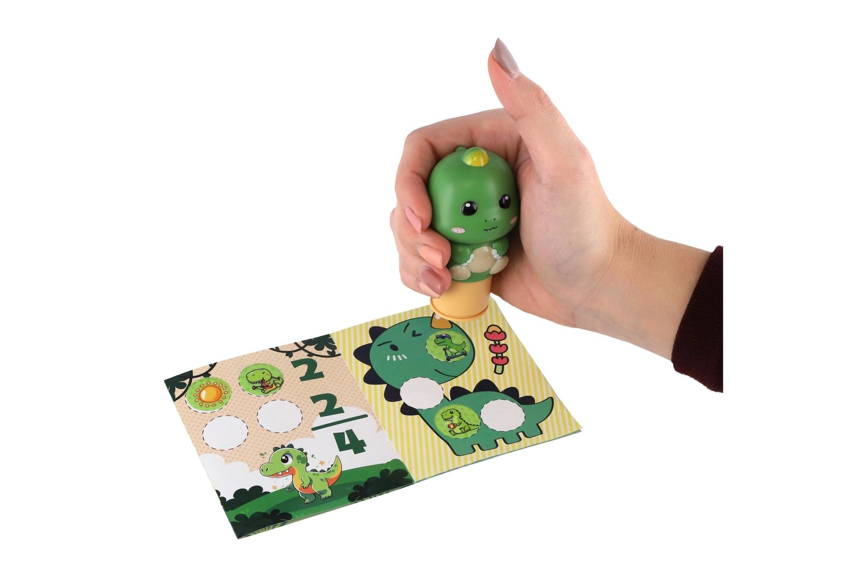 Tato kreativní sada s dinosauřím razítkem podporuje dětskou fantazii a jemnou motoriku. Ergonomický tvar je uzpůsoben malým ručkám, takže se s razítkem pohodlně pracuje. Součástí jsou barevná samolepková kolečka s motivy dinosaurů a tematický arch, kam si mohou děti své výtvory lepit.