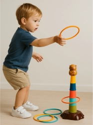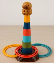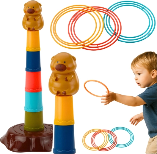 Tato dětská házecí hra s kroužky přináší veselý motiv kapybary a snadné sestavení pětipatrové věže. Úkolem je házet kroužky tak, aby dopadly na věž – děti si tak přirozeně trénují přesnost, soustředění i koordinaci oko–ruka. Lehké a bezpečné plastové díly se příjemně drží a jsou vhodné i pro mladší děti.