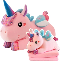 Roztomilý plyšový jednorožec 3v1 kombinuje mazlivou hračku, měkoučký polštářek a teplou fleecovou deku 160 × 110 cm. Z bříška stačí rozepnout zip a vyjmout deku – ideální na spánek, cestování i odpočinek. Jemný, k dětské pokožce šetrný měkký plyš a kouzelný vzhled s barevným rohem a křidélky zaručí pohodlí i radost ze hry.