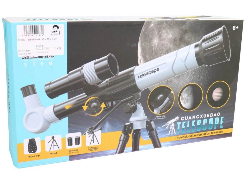 Součástí je stabilní stativ pro pohodlné sledování a točící knoflík pro nastavení ohniskové vzdálenosti, který usnadní ostrý a čistý obraz. Praktický klip na telefon umožní připevnit mobil a pořídit snímky z vašich objevů.