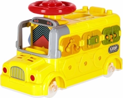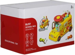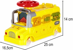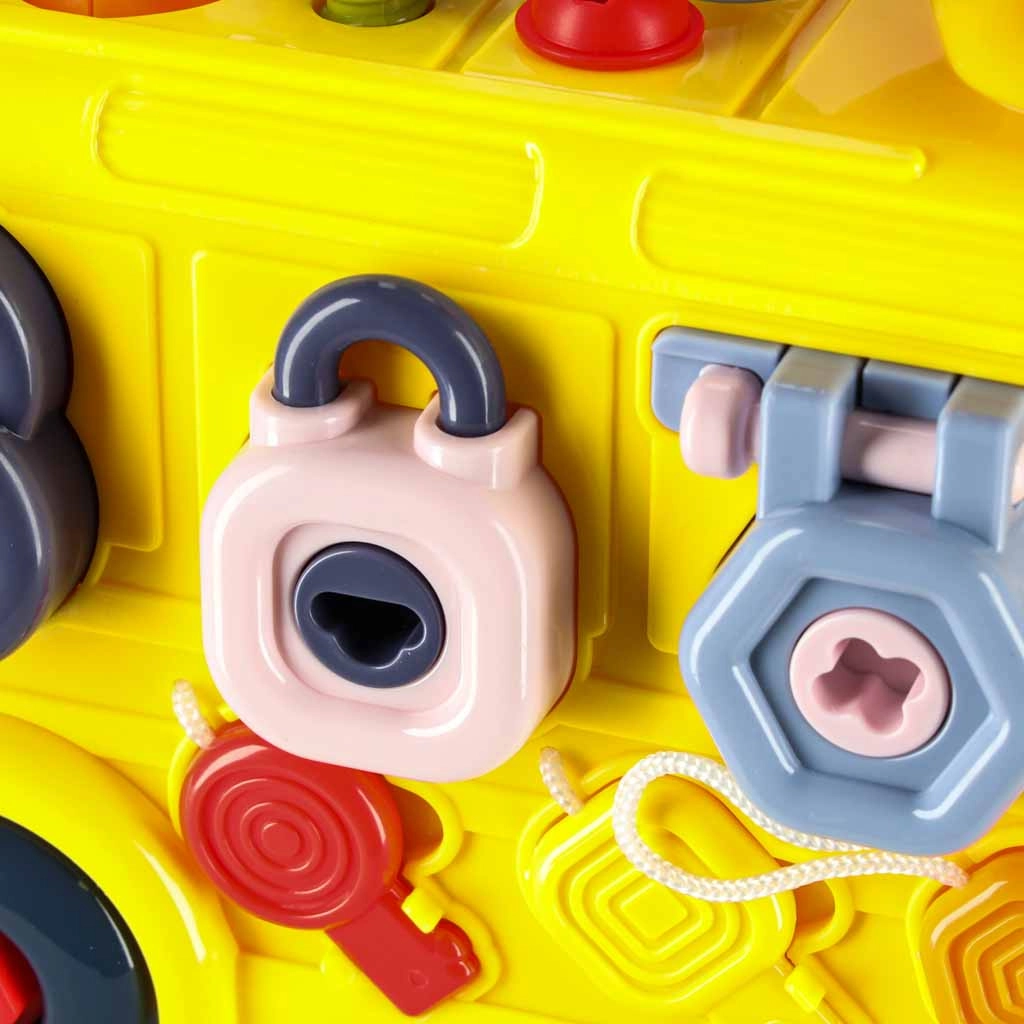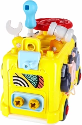 Interaktivní autobus kombinuje vozidlo a mini dílnu v jednom. Děti mohou jezdit, šroubovat, zkoušet zámky s klíči, otáčet volantem a prozkoumávat „motor“ pod výklopnou kapotou. Různorodé úkoly přirozeně rozvíjejí jemnou motoriku, trpělivost i řešení problémů.
