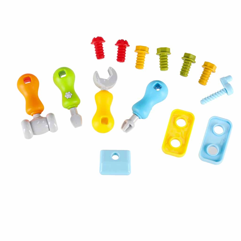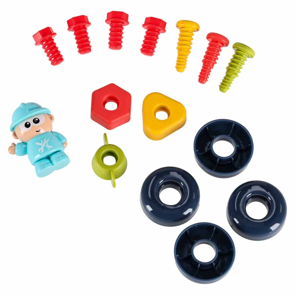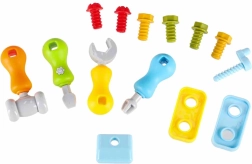 Sada obsahuje šroubky, matičky, převody, šroubováky, klíč a kladívko. Děti trénují přesnost a koordinaci při připevňování dílů a tréninku tvarů.