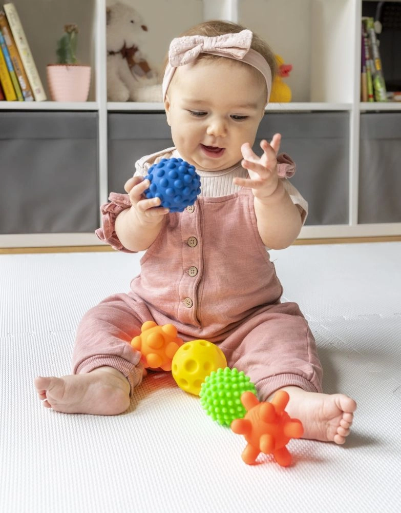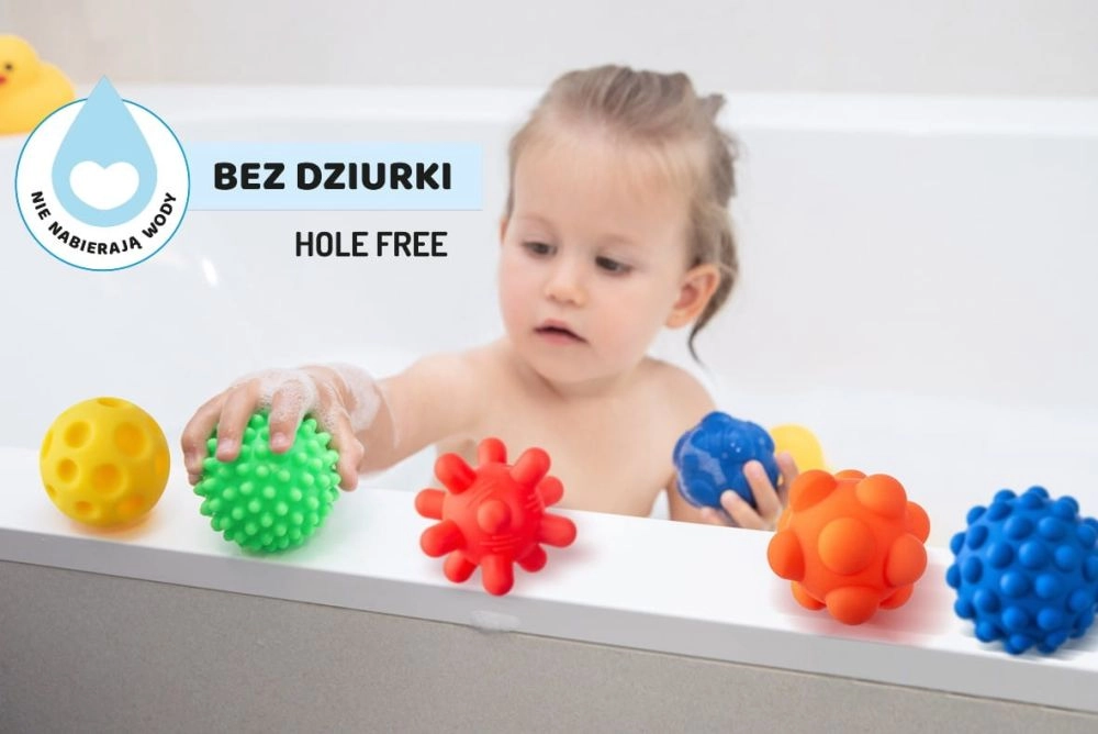 Sada obsahuje pět barevných míčků s různorodými povrchy – od jemných výstupků po výraznější hroty – které lákají ke zkoumání dotykem, mačkání i kutálení. Bezpečná, měkká guma zajišťuje příjemný stisk a jistý úchop malých ručiček, zatímco absence dírek brání zadržování vody a nečistot.