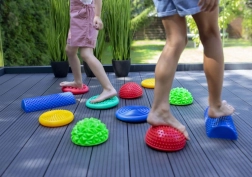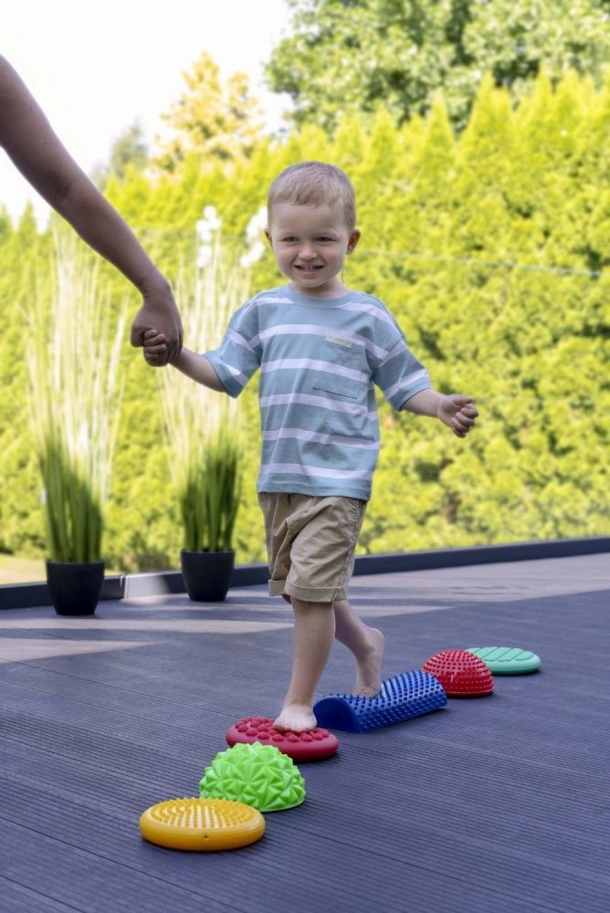 Sada šesti barevných prvků s výstupky a drážkami je navržena pro chůzi naboso, trénink stability a rozvoj hrubé motoriky. Protiskluzové textury zvyšují jistotu kroku a přirozeně aktivují svaly chodidel, kotníků i středu těla. Díky modulárnímu uspořádání lze vytvořit přímou stezku, slalom nebo překážkovou dráhu.