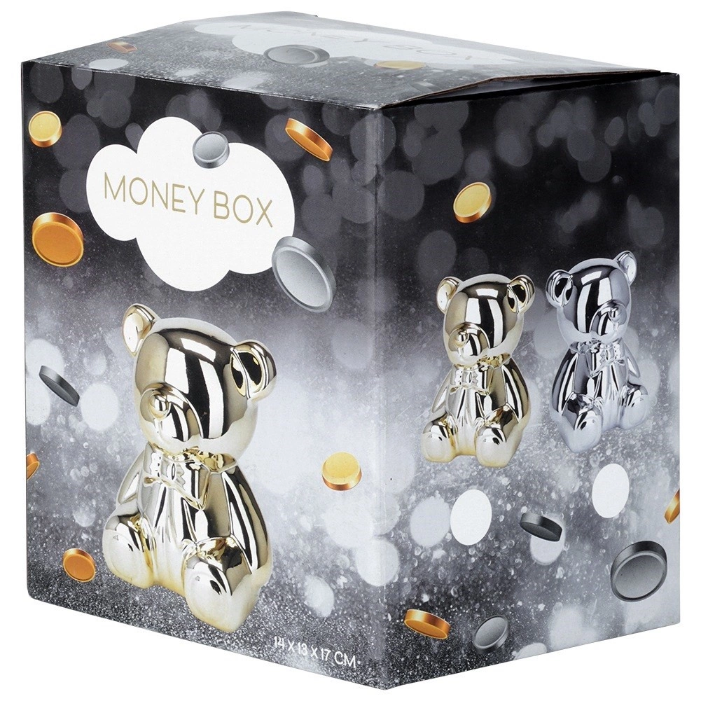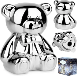 Tato stříbrná keramická pokladnička ve tvaru medvídka spojuje moderní glamour design s praktickým využitím. Zrcadlový lesk dodá interiéru nádech luxusu a současně motivuje k pravidelnému spoření mincí i bankovek.