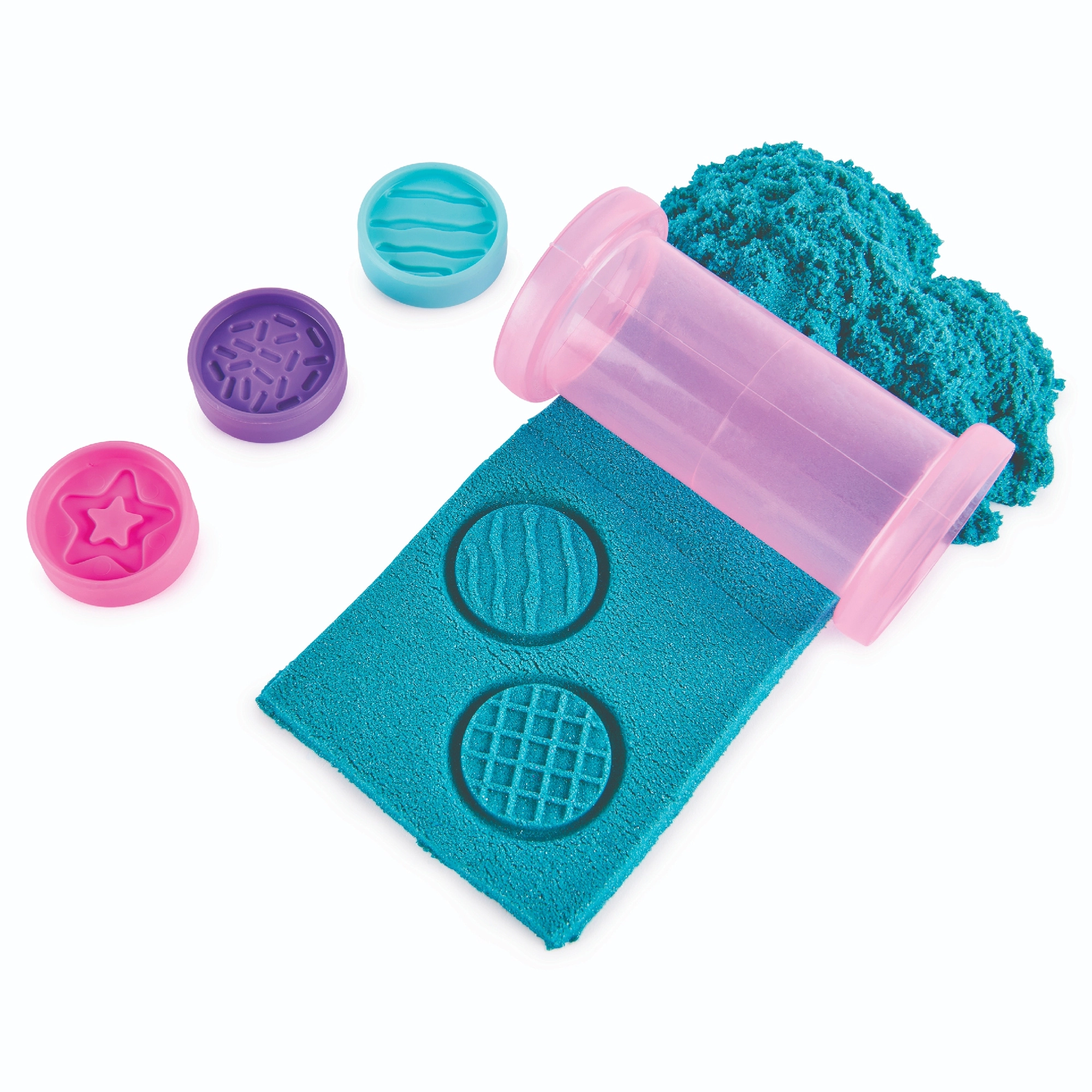 Váleček a kulatá razítka vytvářejí v písku detailní vzory – hvězdičky, mřížku či vlnky. Písek se lepí jen na sebe, takže úklid je hračka.