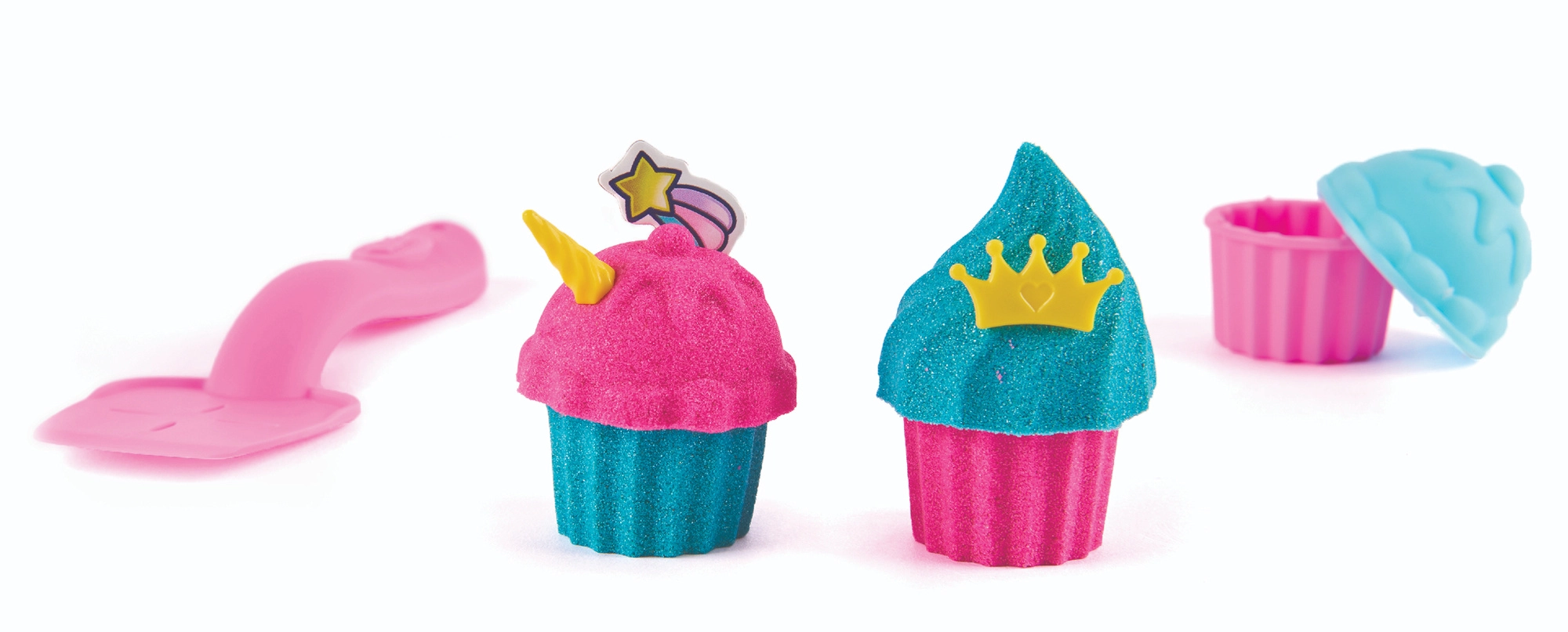 Vytlačte těsto, vytvořte košíčky a ozdobte jednorožčími dekoracemi. Dvě barvy písku umožní vrstvení „těsta“ a „polevy“ přesně jako v cukrárně.