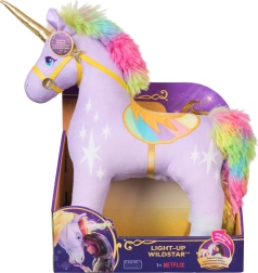 Plyšový jednorožec WILDSTAR je inspirován oblíbeným seriálem UNICORN ACADEMY. Je vyroben z hebkého lila plyše se světlými „magickými“ motivy, má třpytivý zlatý roh a kopyta, duhovou hřívu i ocas a elegantní postroj. Po dotyku čela se rozsvítí roh i dekorativní prvky na těle teplým LED světlem a zazní kouzelný zvuk.