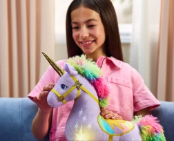 Objevte kouzelný svět UNICORN ACADEMY s plyšovým jednorožcem WILDSTAR. Tato měkoučká hračka o výšce 35 cmsvětelné efekty v rohu a na těle a doprovodný zvuk. Díky jemnému lila plyši, duhové hřívě a ocasu a zlatým detailům je ideální pro mazlení i kreativní hraní.