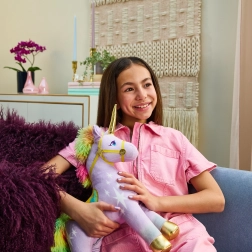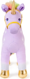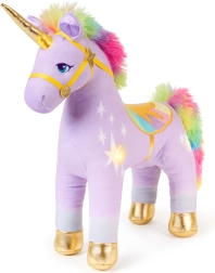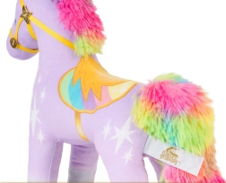 Měkoučký lila materiál, duhová hříva a ocas a zlaté akcenty zajišťují prémiový vzhled i příjemný dotek při mazlení.