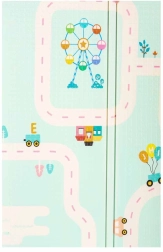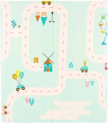 Roztomilé pandy na jedné straně a silniční motiv na druhé rozvíjejí představivost, učení a zábavu s autíčky i stavebnicemi.