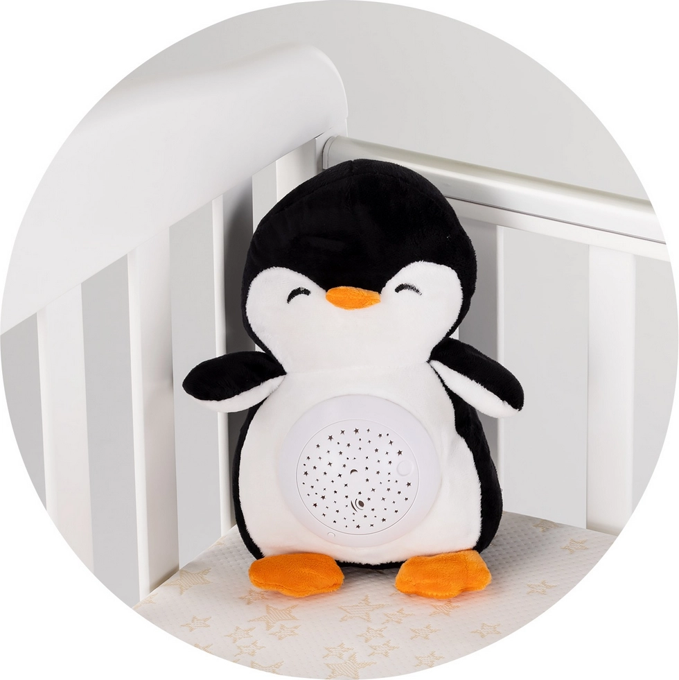Tento hebký tučňák s vestavěným projektorem a hudební skříňkou vykouzlí na stěnách pokojíčku hvězdnou oblohu a jemnými melodiemi pomůže dětem klidně usnout. Jediným stiskem tlačítka se projektor roztočí a vytvoří působivou barevnou projekci, která zklidní atmosféru před spaním.