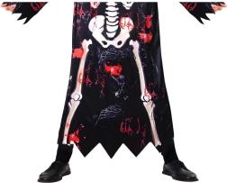 Dlouhý černý plášť s kosterním potiskem a roztřepenými okraji vytváří výrazný efekt, který zaujme na první pohled.