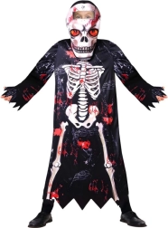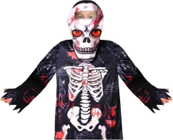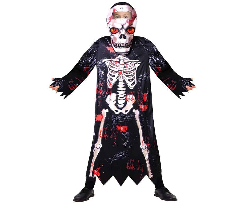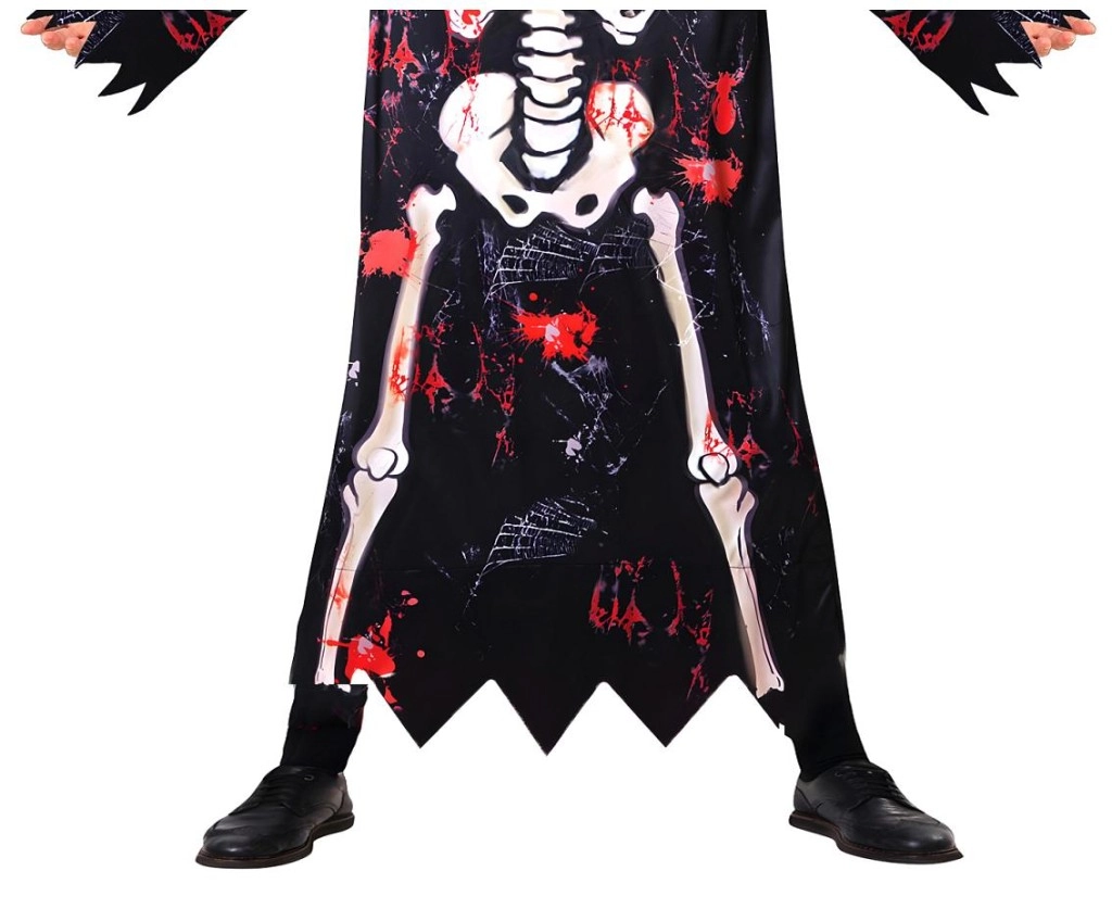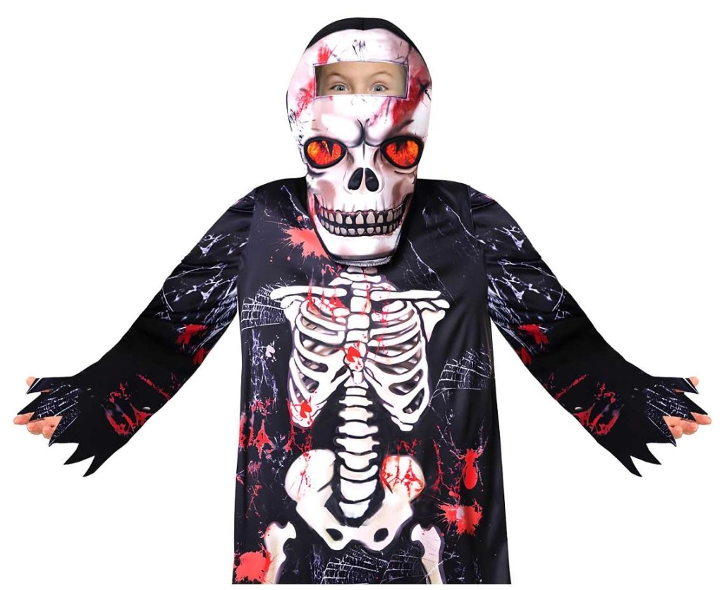 Díky lehkému materiálu se kostým pohodlně nosí a umožňuje volný pohyb při hraní i tanci. Výrazný kontrastní potisk kostí s červenými akcenty dodá dítěti strašidelný, ale zároveň zábavný look bez složitého líčení.