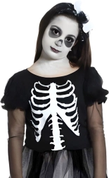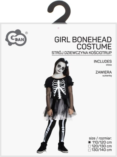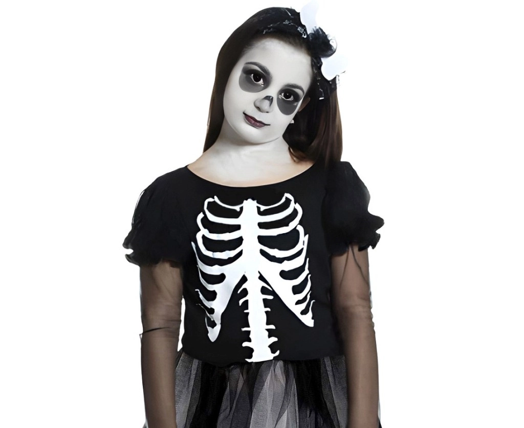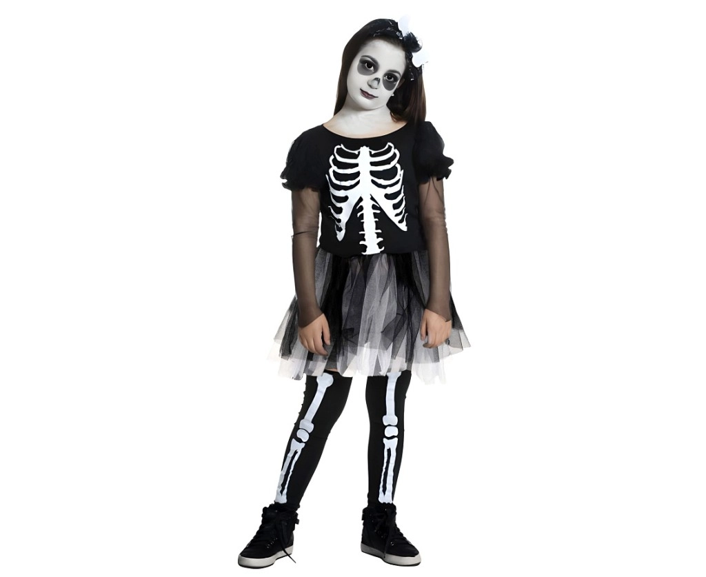 Udělejte dojem na každé oslavě s tímto stylovým dívčím kostýmem kostlivce. Černé šaty s výrazným potiskem kostry, průsvitnými balónovými rukávy a vrstvenou tylovou sukní vytvářejí působivý a zároveň pohodlný outfit pro malé strašidlo.