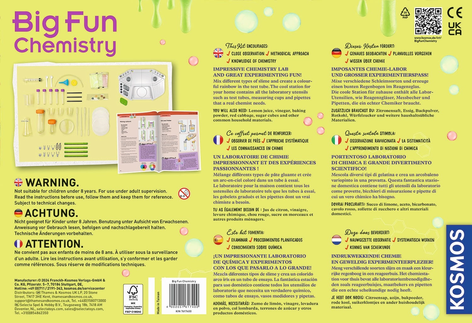 Vstupte do světa vědy s bezpečnou a chytře navrženou chemickou laboratoří pro děti. Sada KOSMOS umožní mladým badatelům provádět jednoduché a poutavé pokusy, rozvíjet logické myšlení a zvídavost. Díky přiloženému digitálnímu českému návodu je příprava i průběh experimentů přehledný a srozumitelný.