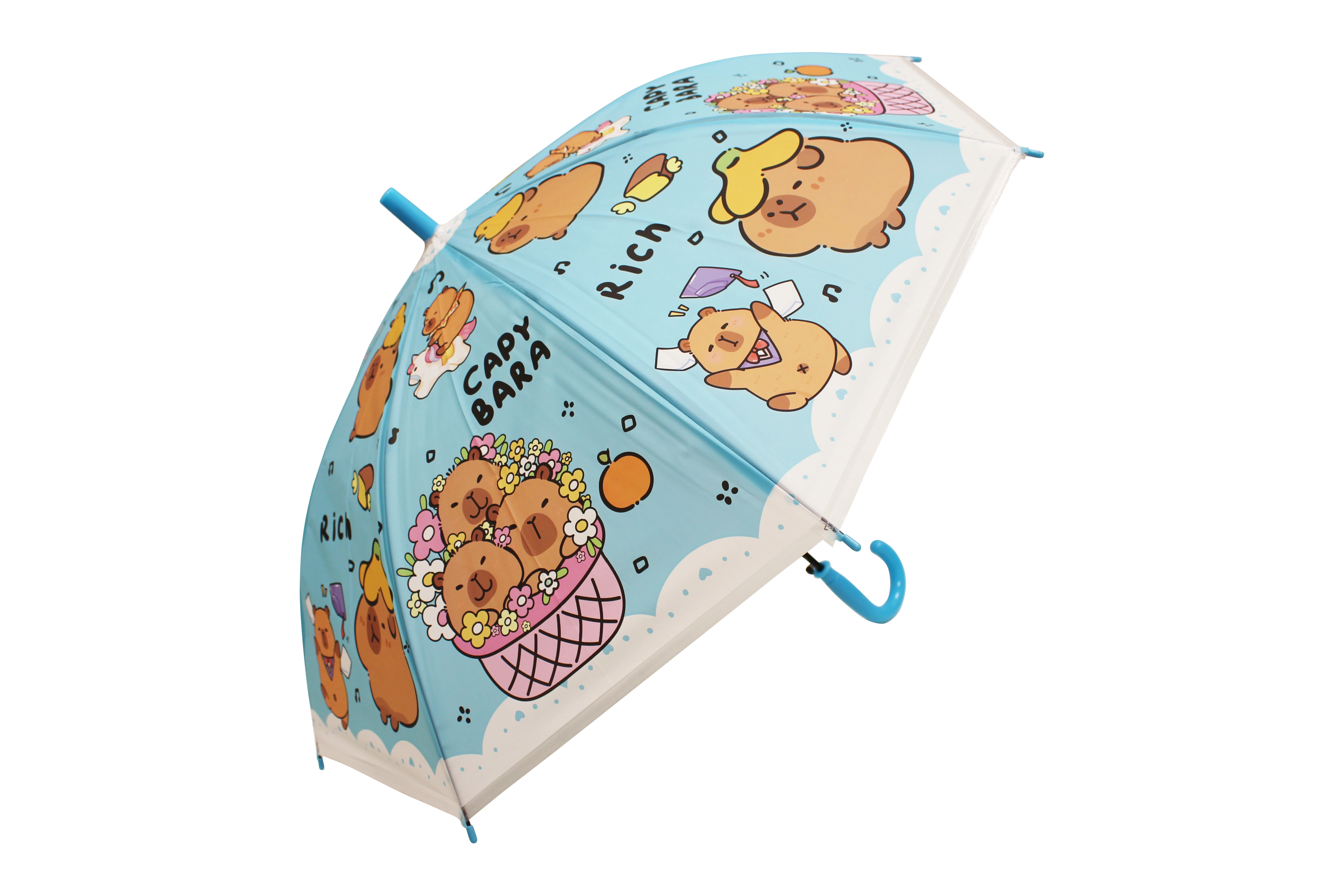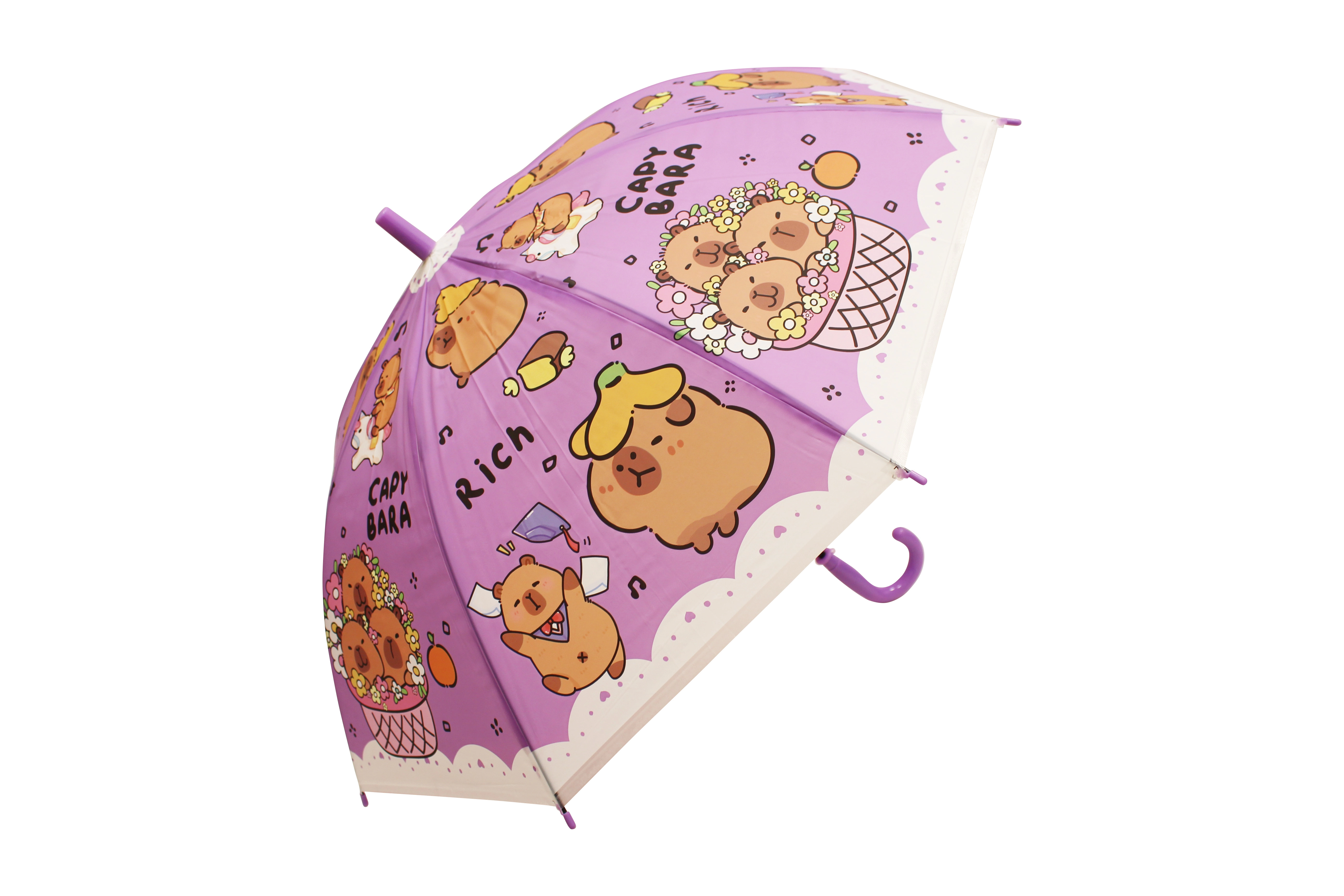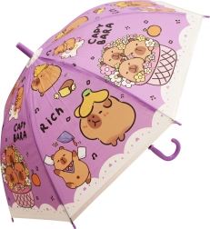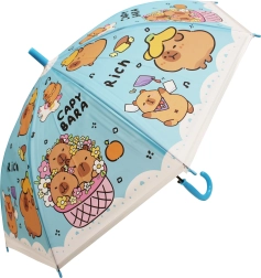 Dětský deštník s kapybarou o délce 50 cm nabízí spolehlivou ochranu proti dešti a veselý vzhled, který si děti zamilují. Barevné varianty (modrá, zelená, žlutá, fialová) s potiskem „CAPYBARA“ a roztomilými ilustracemi z něj dělají stylový doplněk do školky i na procházky.