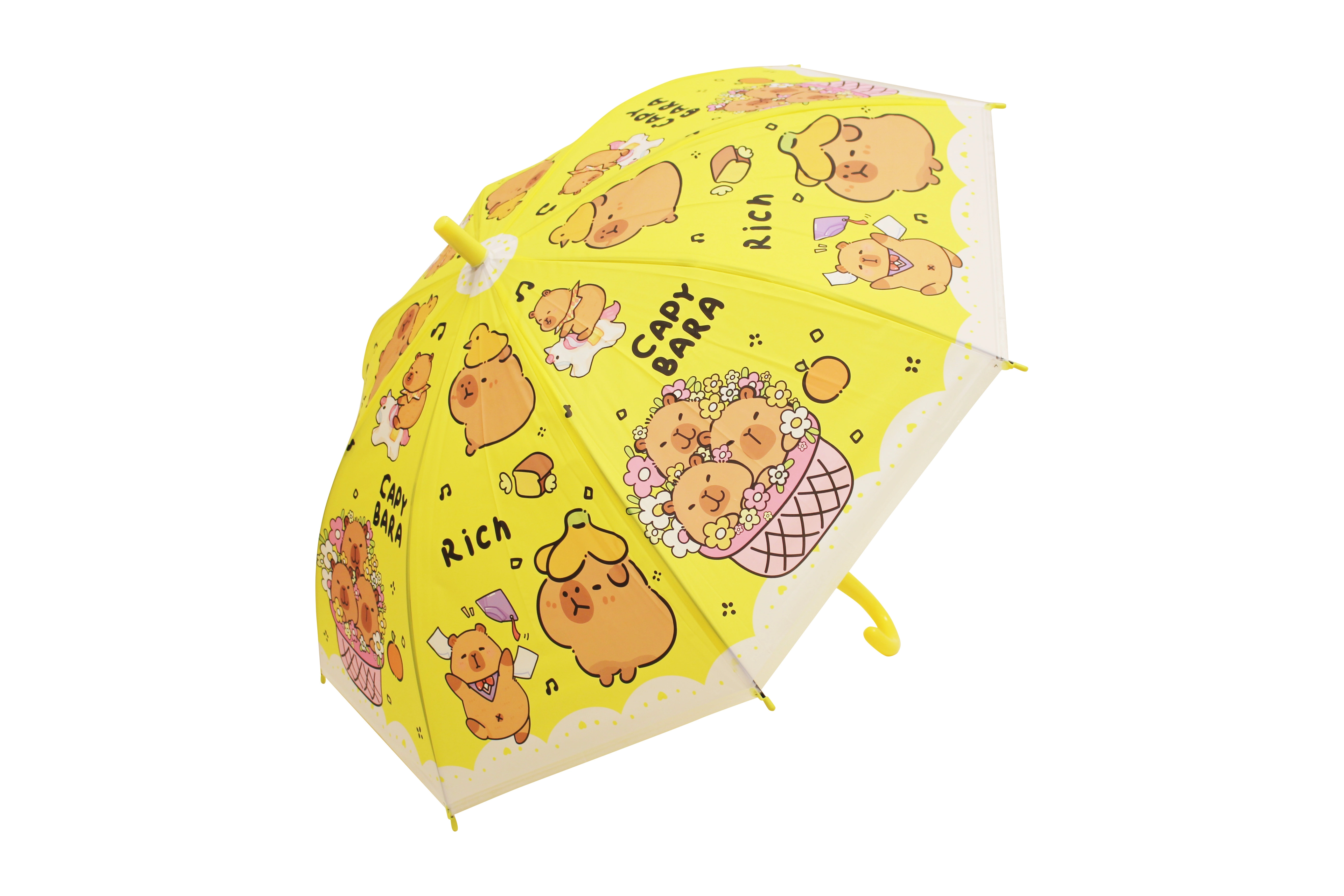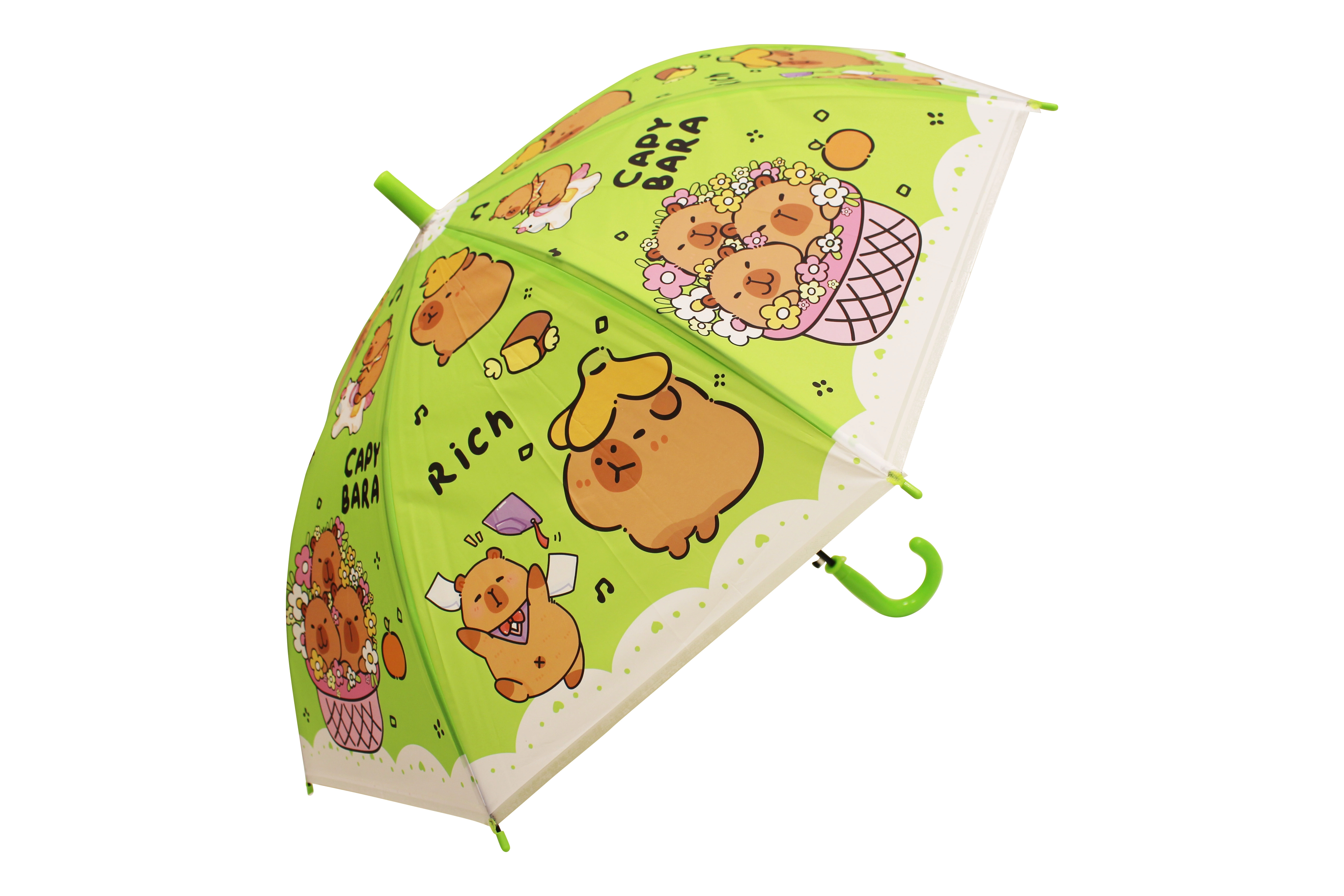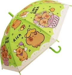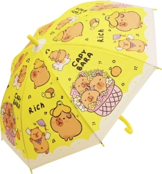 Roztomilý dětský deštník s motivem kapybary chrání před deštěm a rozzáří každý den. K dispozici ve čtyřech barvách – modrá, zelená, žlutá a fialová – s pohodlným zahnutým madlem a lehkou konstrukcí pro snadné nošení. Ideální pro děti díky bezpečnému provedení a hravému designu s kapybarami.