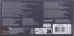 Model je uložen v čirém akrylátovém boxu na černém podstavci, který chrání před prachem a zvýrazňuje detaily zbarvení McLAREN.