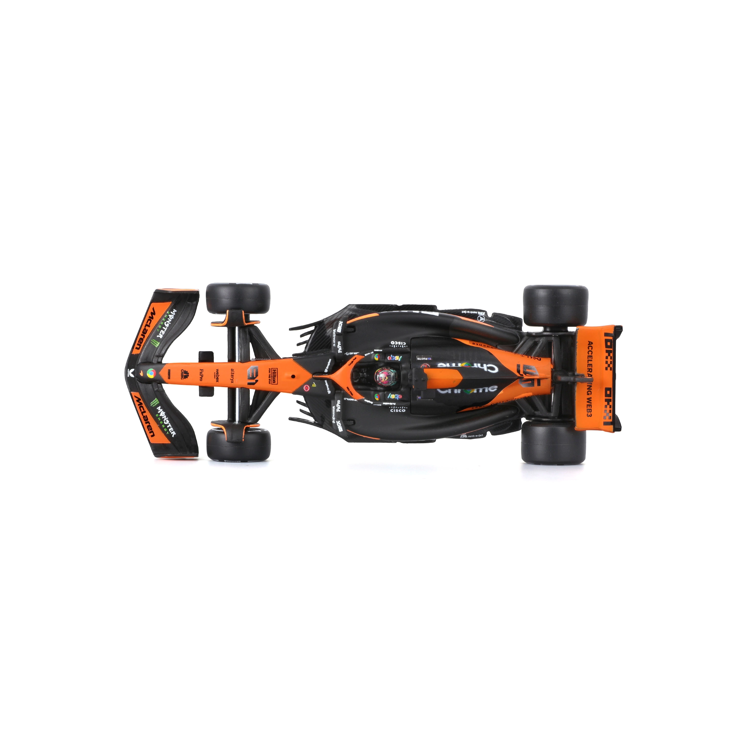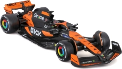 Ikonická kombinace oranžové a černé s týmovými logy a závodními slick pneumatikami potěší každého fanouška F1.