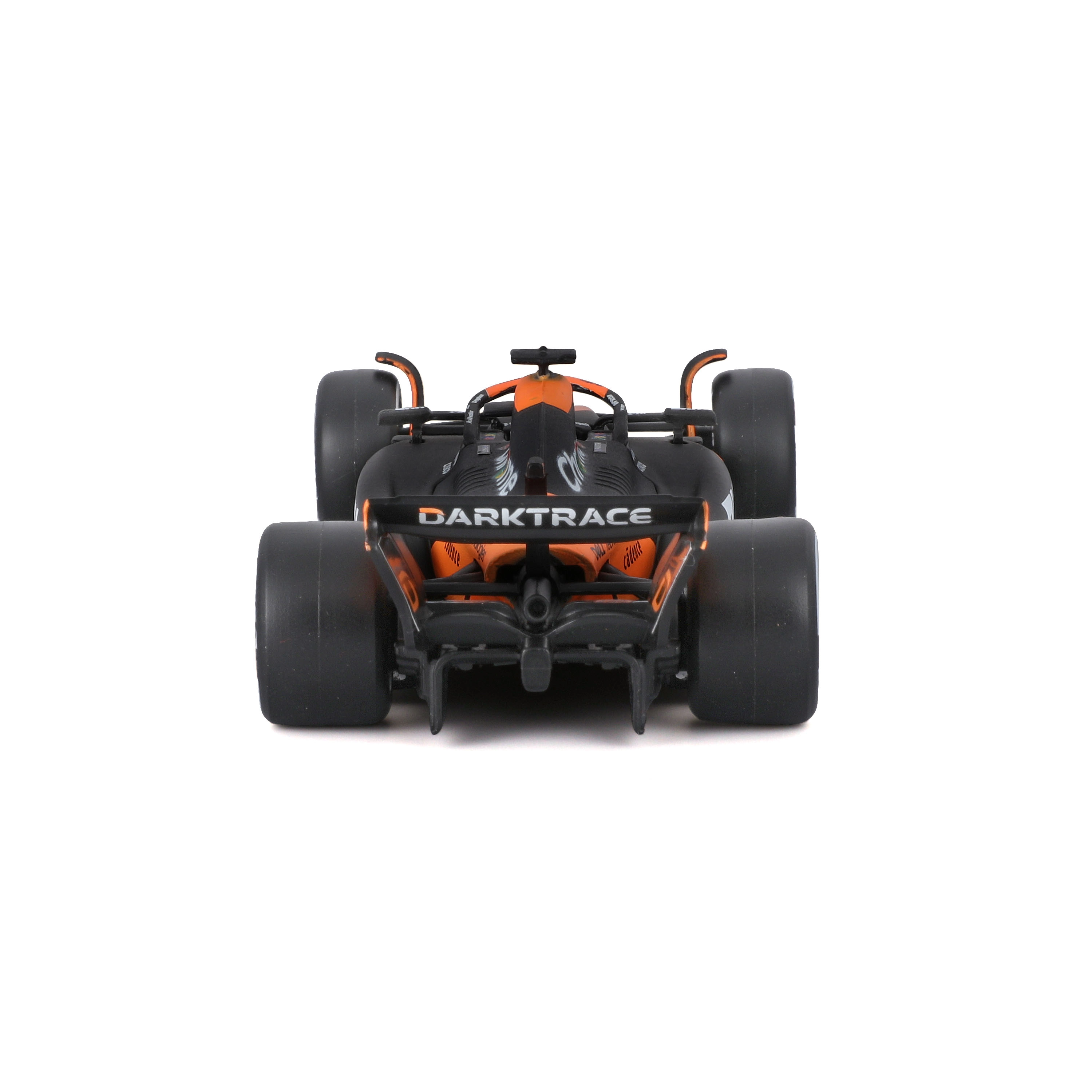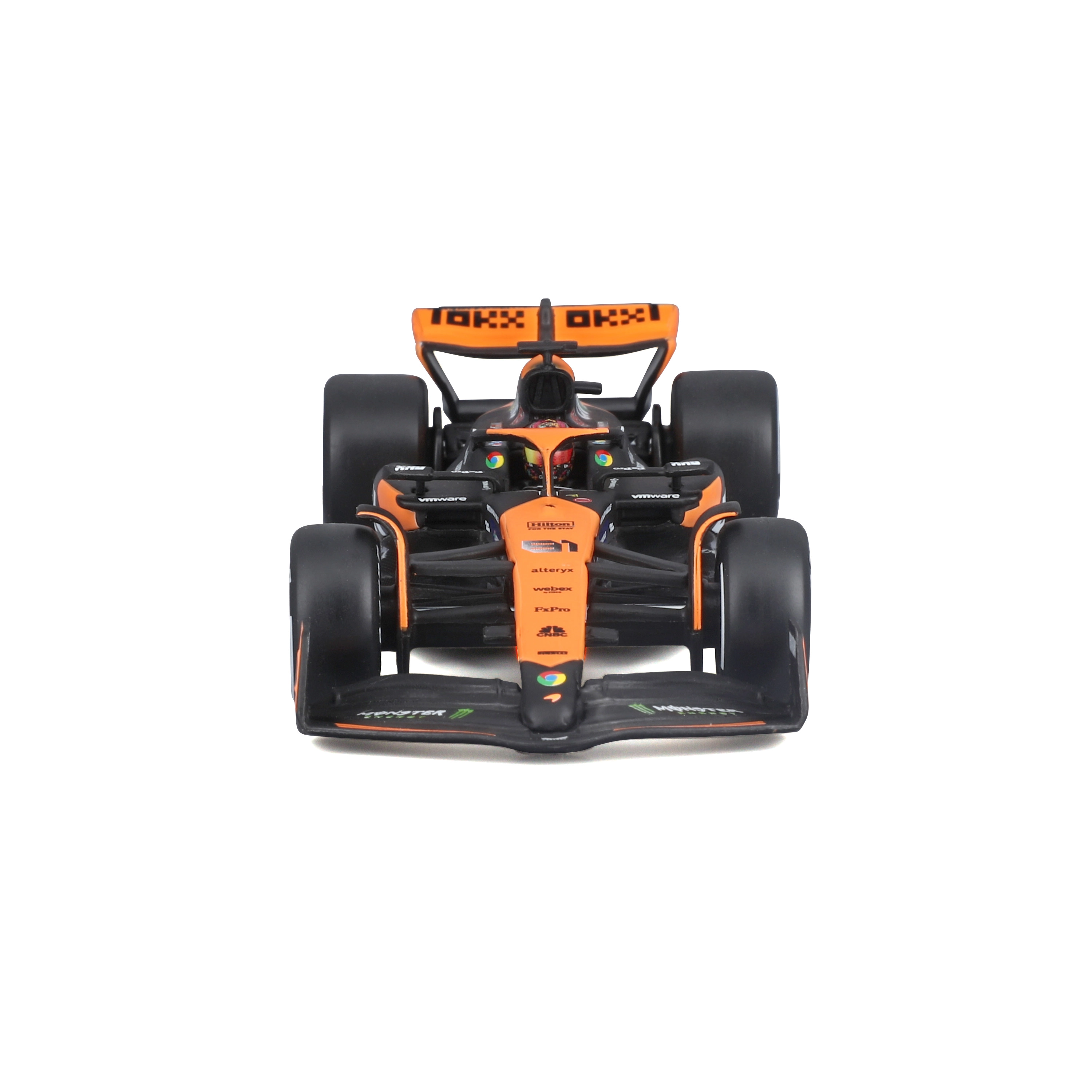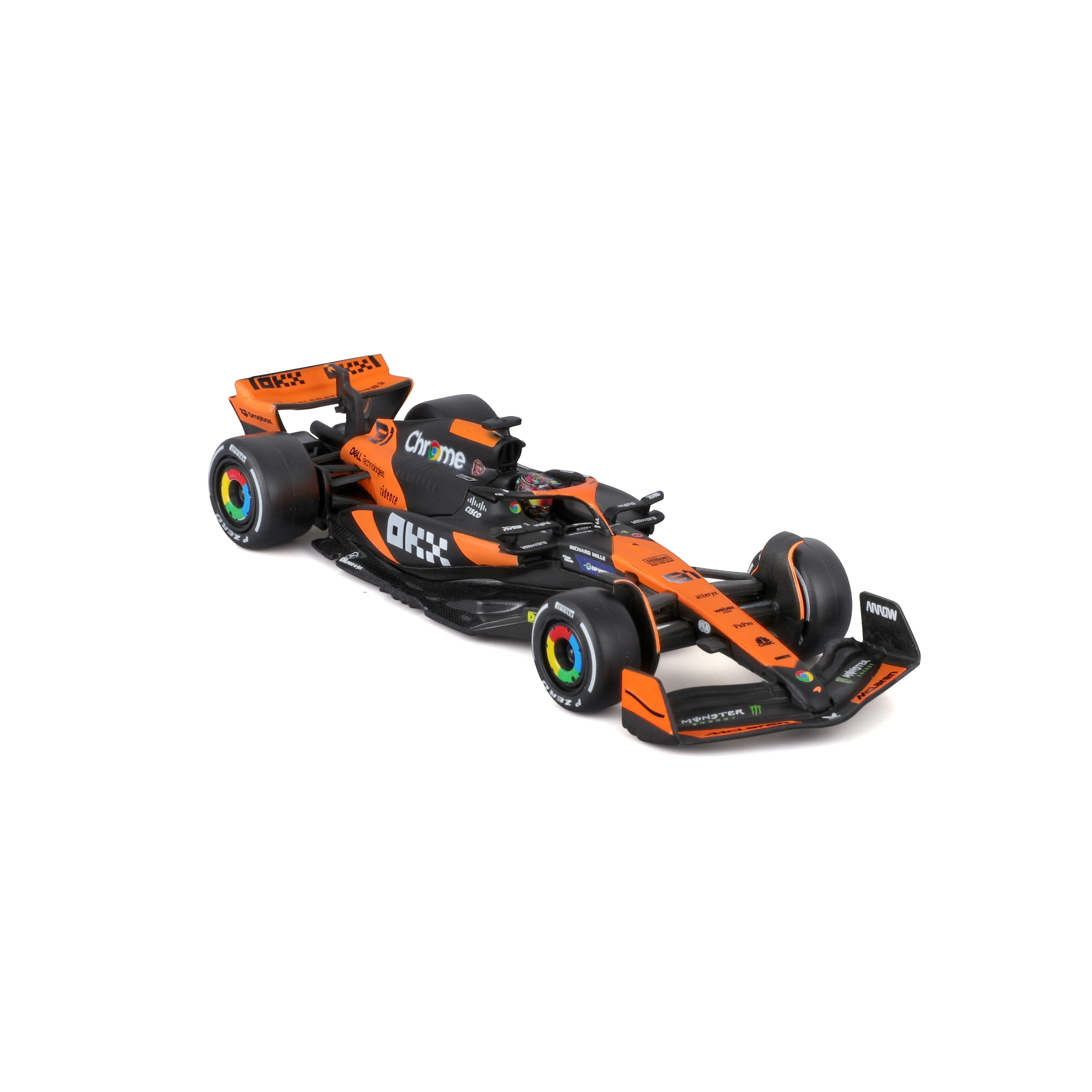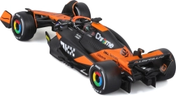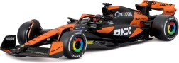 Věrné oranžovo‑černé zbarvení, přesné týmové logotypy a barevné náboje kol zvýrazňují závodní charakter skutečného vozu F1.