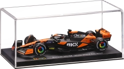 Díky figuře jezdce Oscara Piastriho v kokpitu působí model dynamicky i při statickém vystavení. Průhledný display box na podstavci chrání před prachem a umožňuje prohlížet detaily ze všech stran – ideální pro regál, kancelář i dětský pokoj každého fanouška.