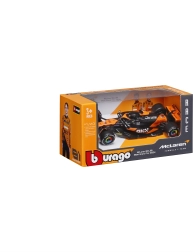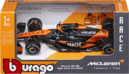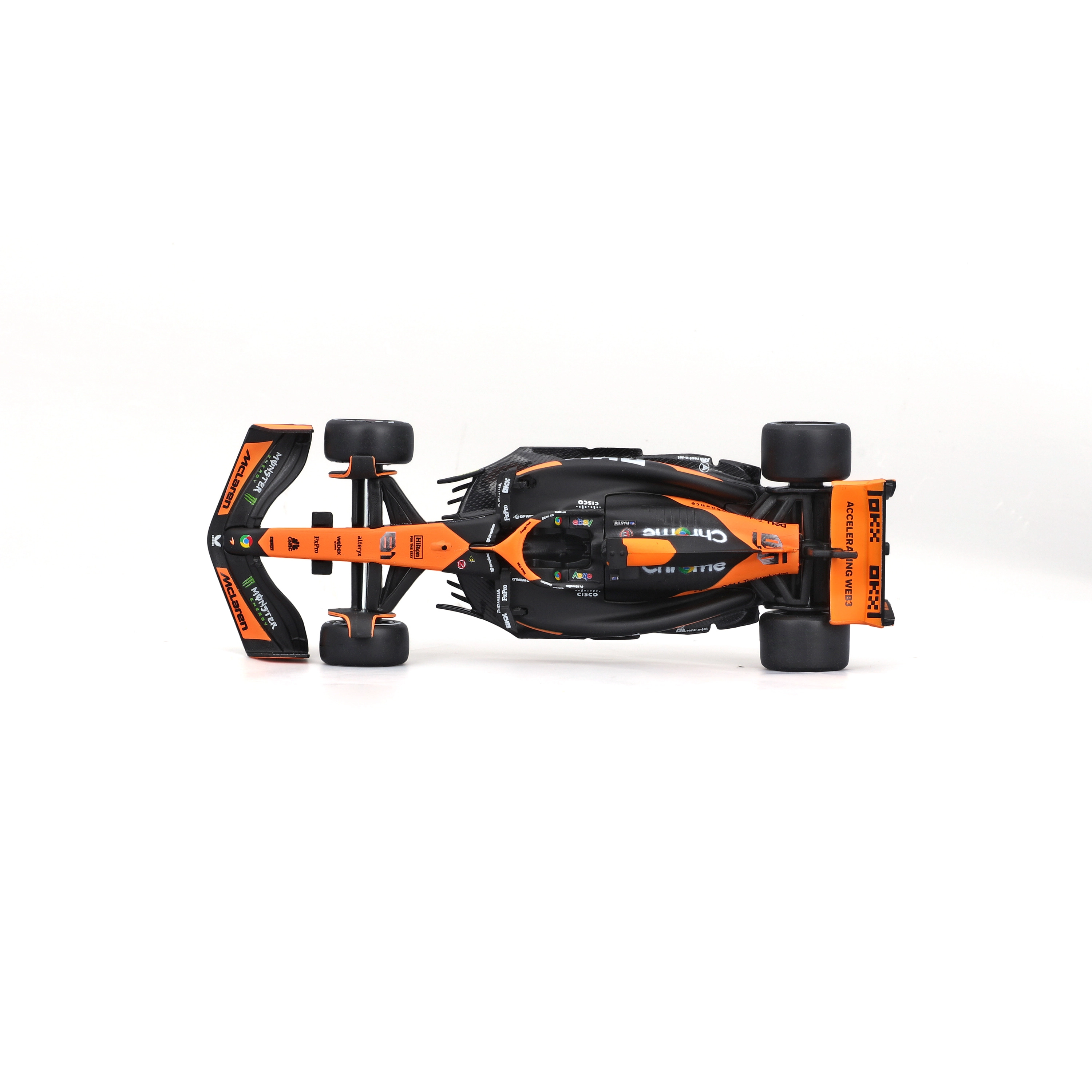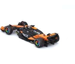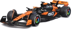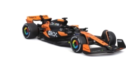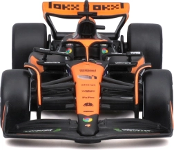 Věrné barevné schéma oranžovo‑černé závodní livery se sponzorskými logy podtrhuje realistický vzhled modelu a přináší zážitek jako na skutečné trati F1.