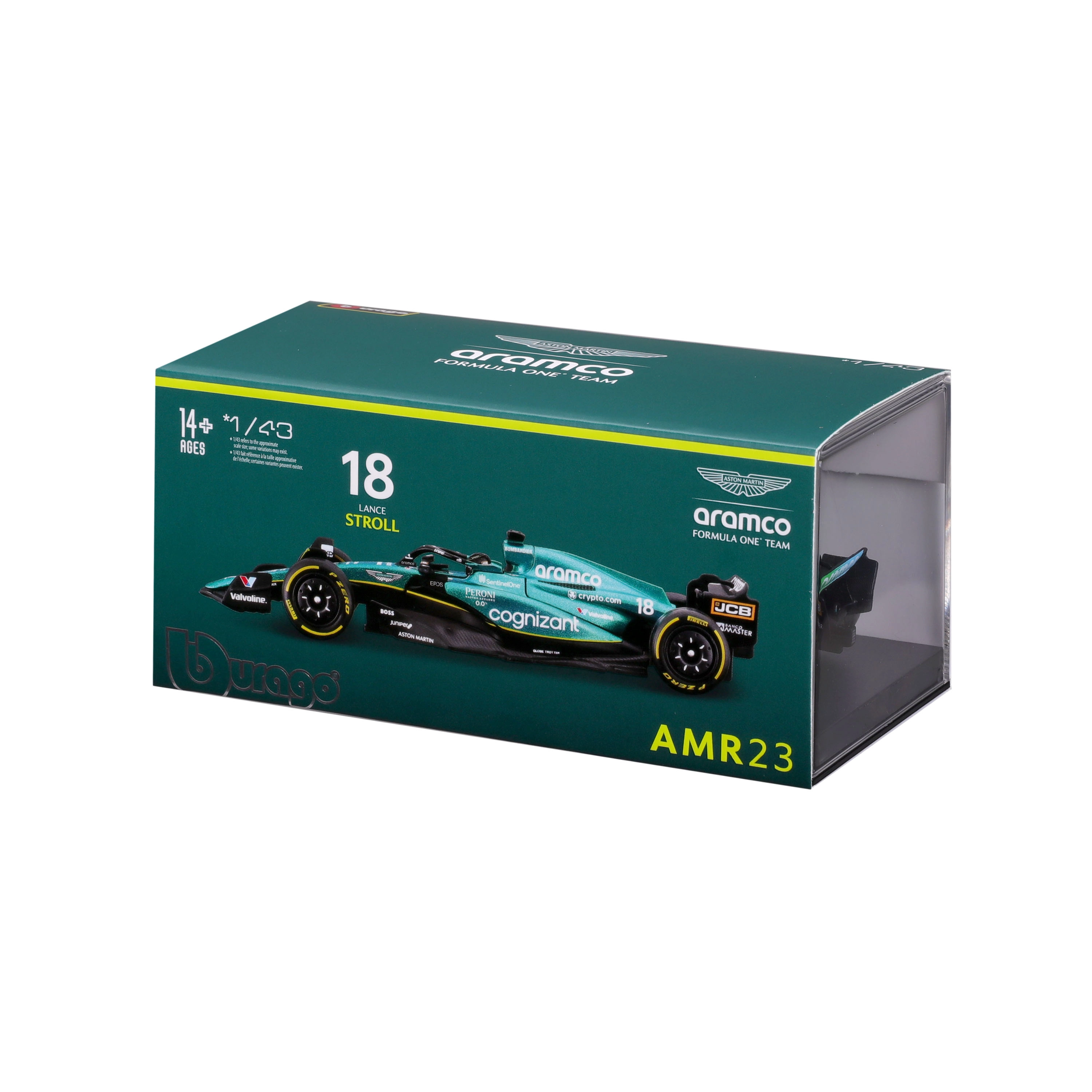 bburago 1:43 formula 1 aston martin amr23 #18 lance stroll – kovový model s řidičem v dárkovém boxu