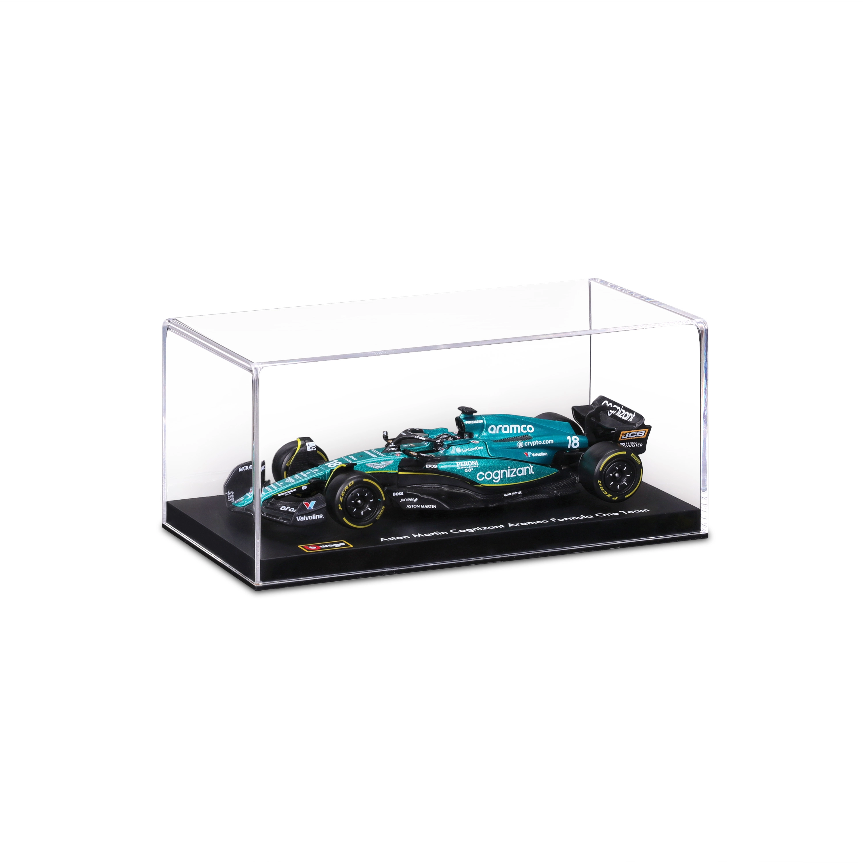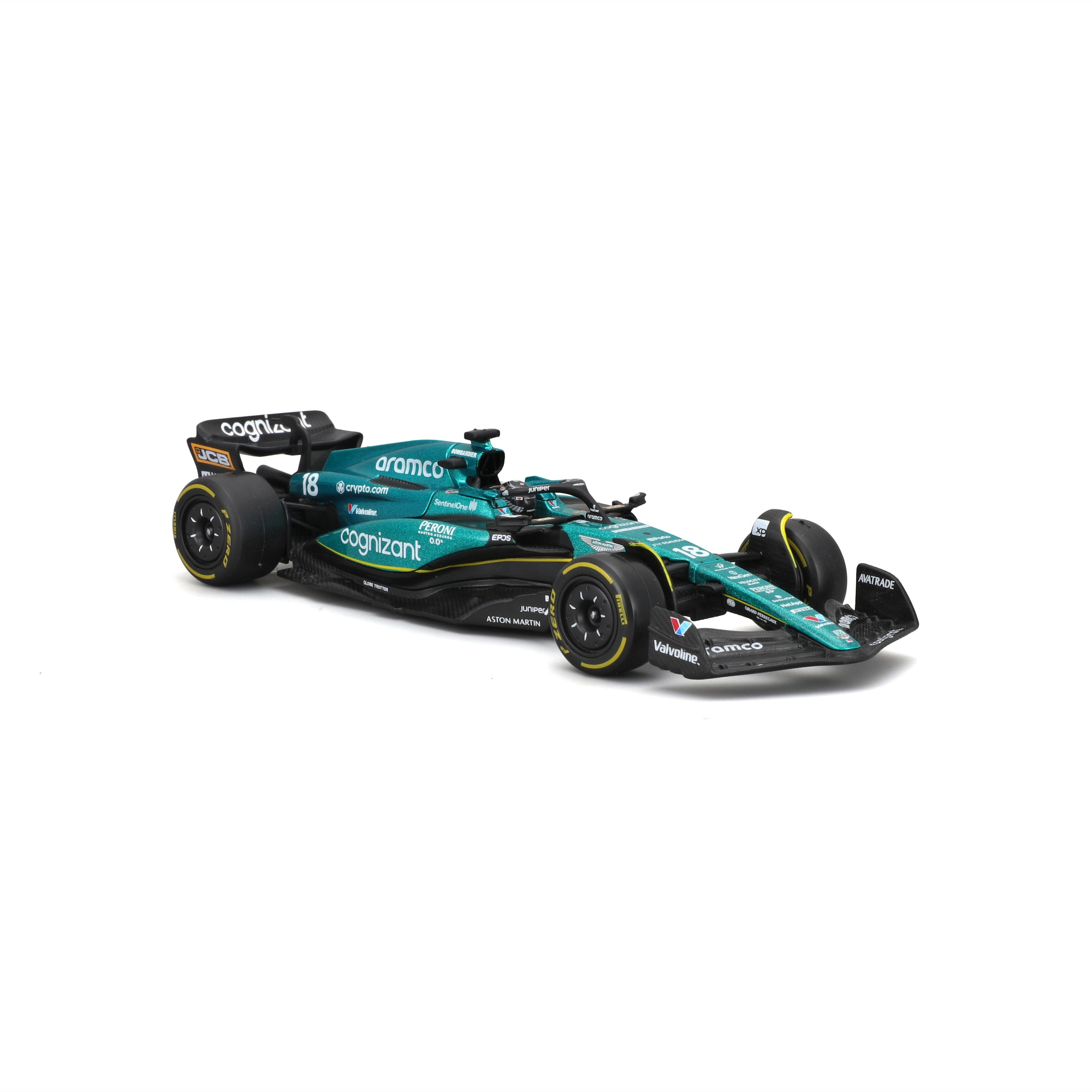 Věrné barvy Aston Martin, loga sponzorů a precizně tvarovaná křídla, halo i difuzor pro maximálně autentický vzhled.