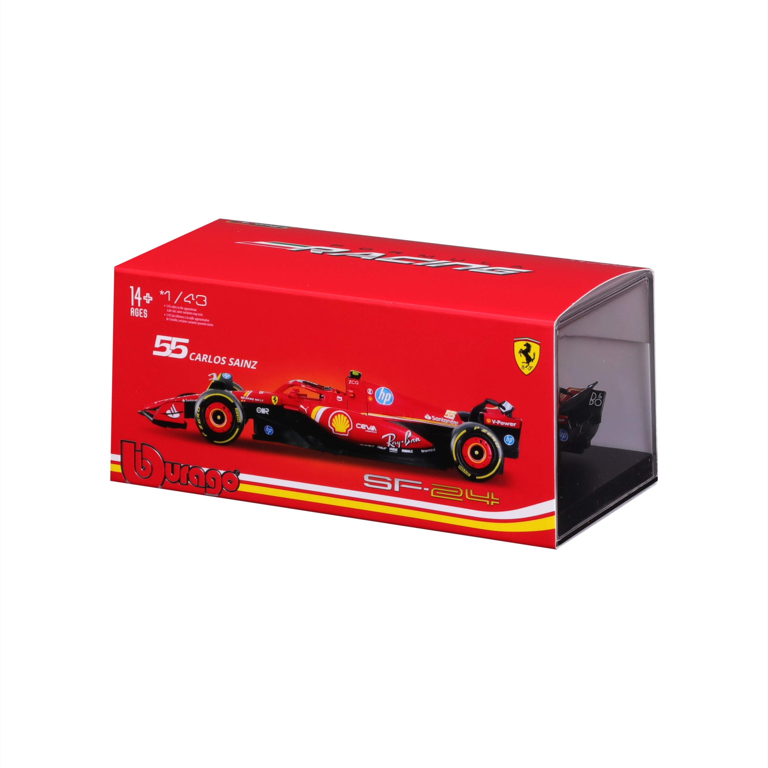 Sbírkové auto pro fanoušky F1: detailní model vozu Ferrari SF-24 v měřítku 1:43 s jezdcem Carlos Sainz, kovovo–plastové provedení, realistické detaily, otáčející se kola a vitrínkový box pro bezpečné vystavení.
