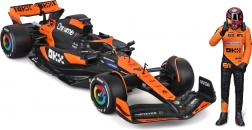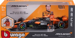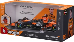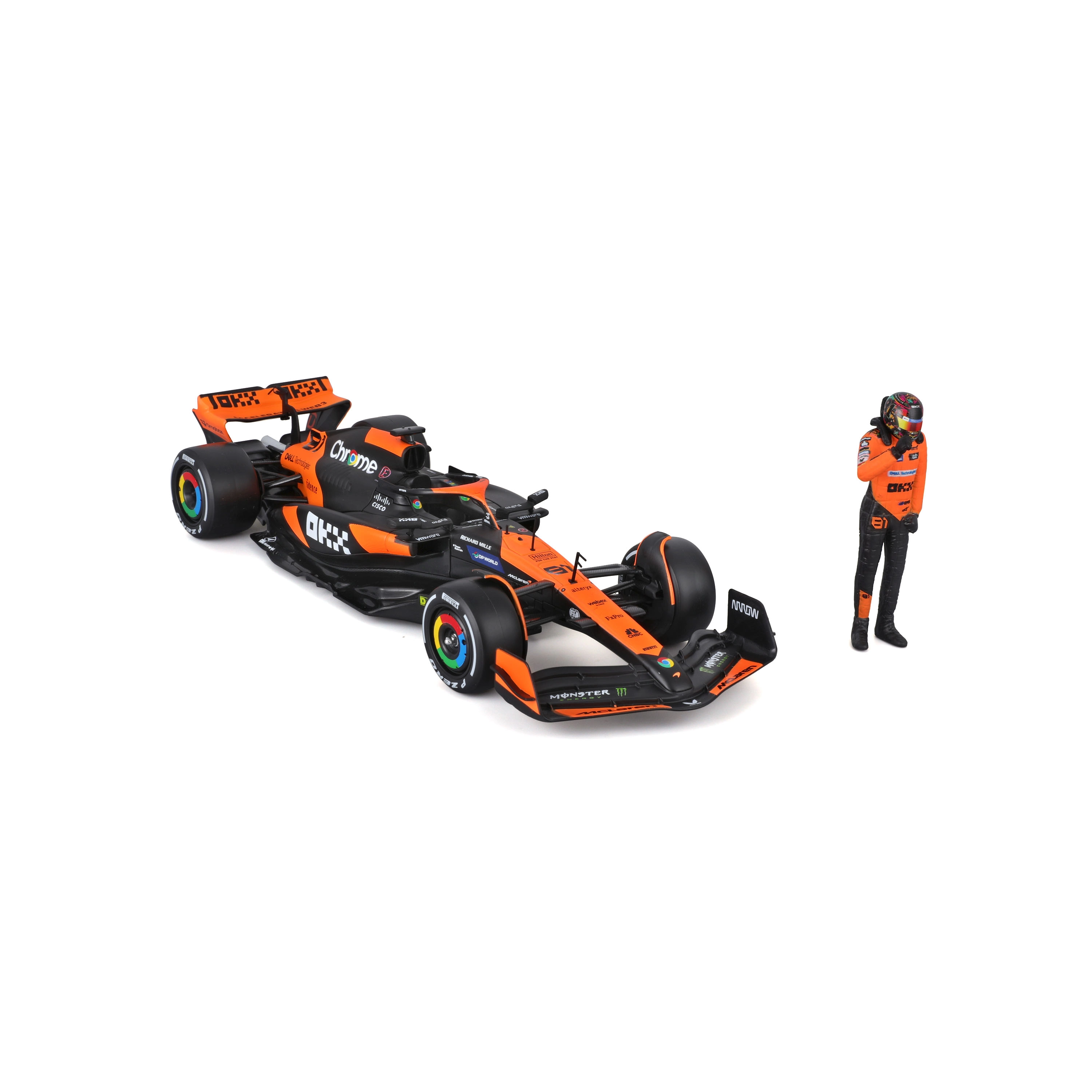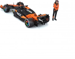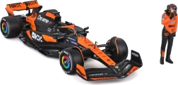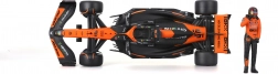 Precizní potisk sponzorů, oranžovo‑černé zbarvení a detailní křídla, difuzor i halo pro autentický vzhled monopostu McLaren MCL38.