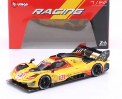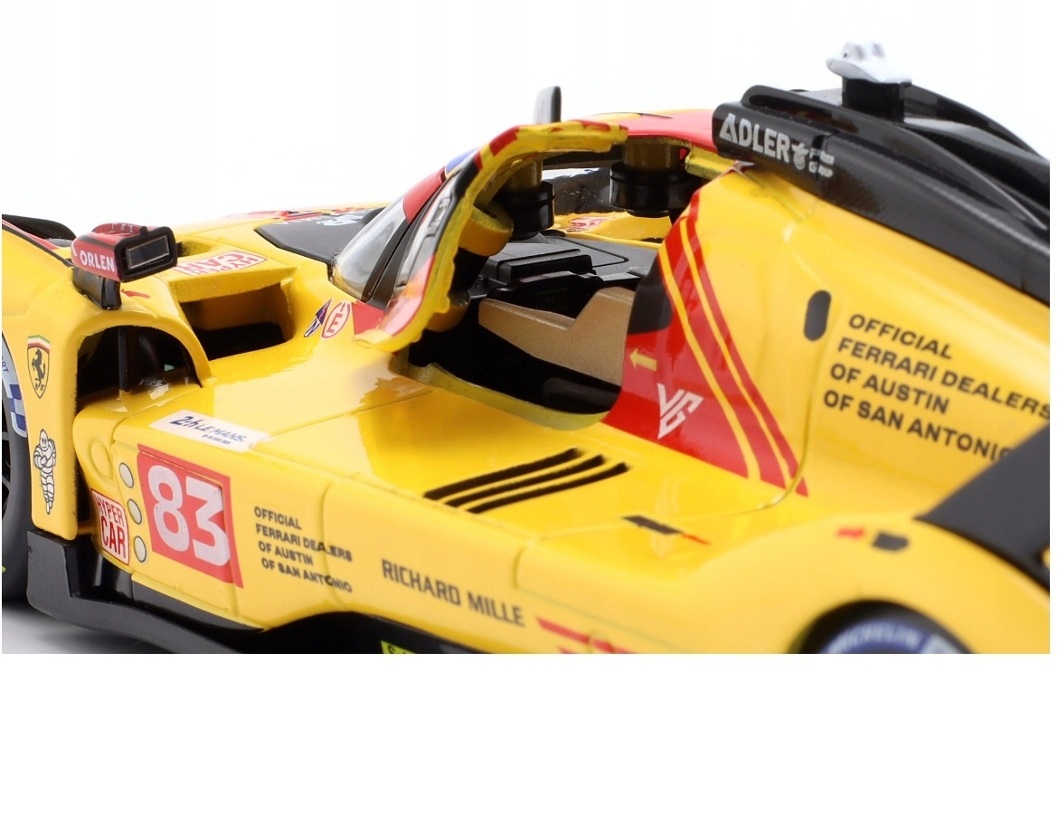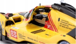 Tento sběratelský model Bburago Ferrari 499P LMH v měřítku 1:24 věrně zachycuje tvary a závodní charakter speciálu třídy Hypercar. Žluté zbarvení a polepy 24h Le Mans 2024 se startovním číslem 83 dodávají modelu autentický vzhled, který vynikne ve vitríně i na pracovním stole.