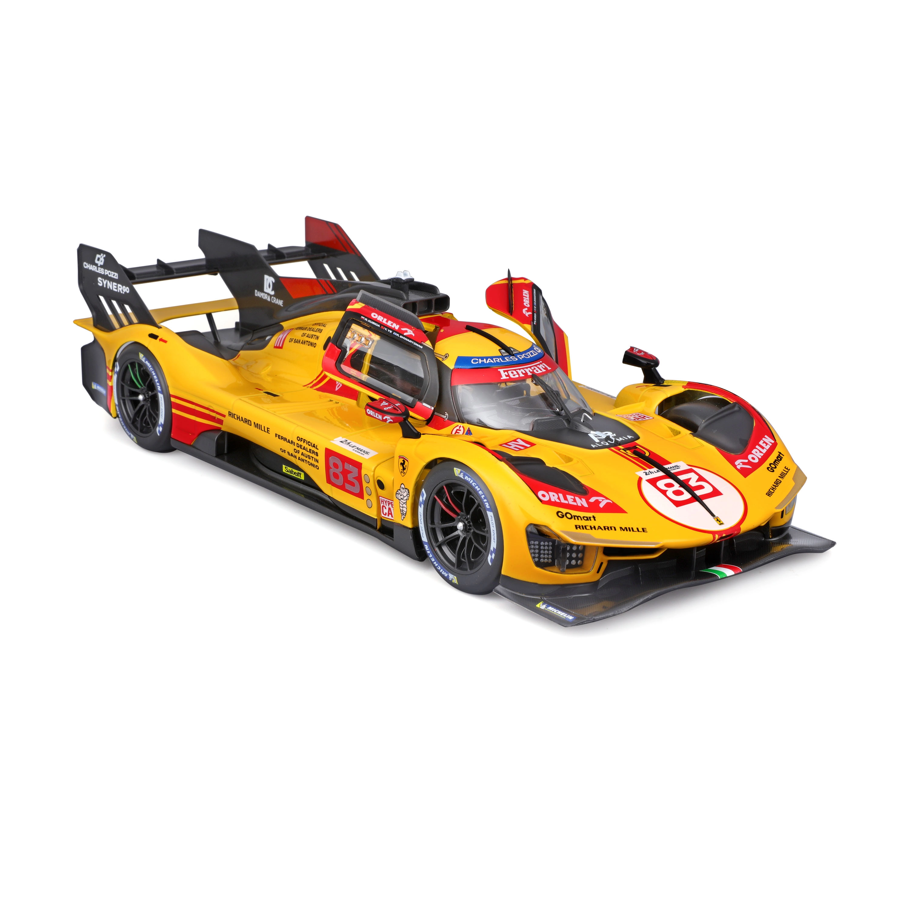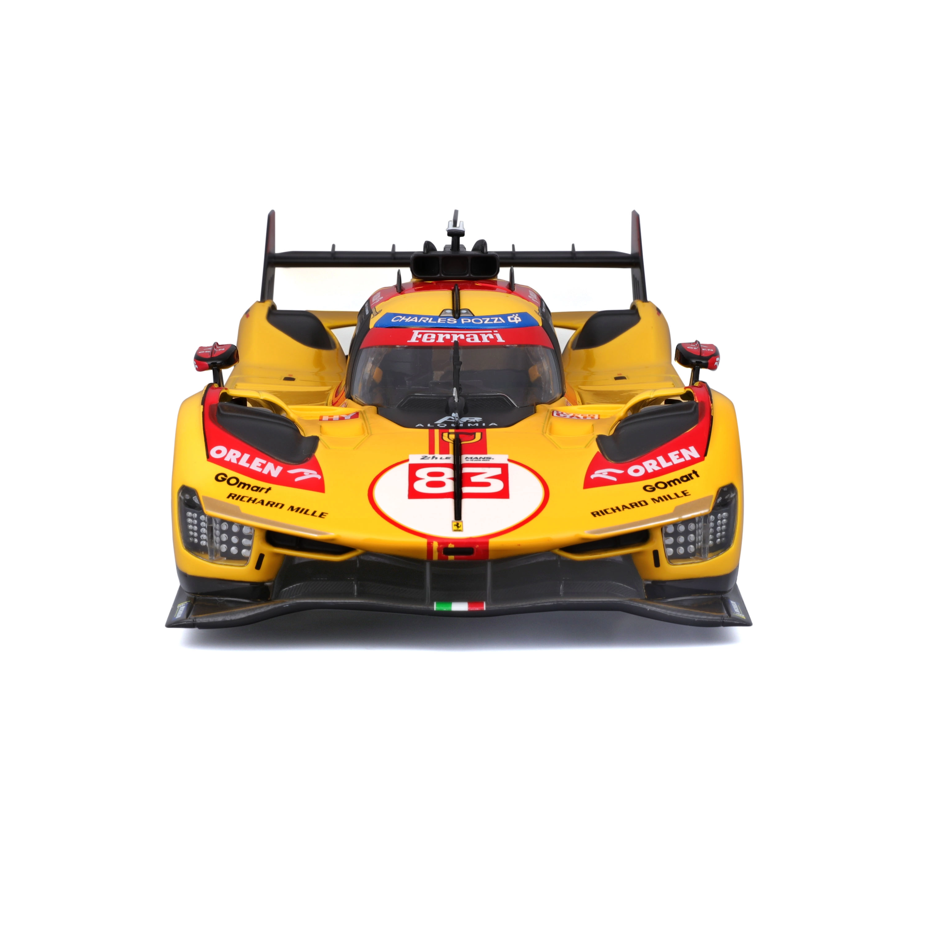 Objevte špičkově zpracovaný model Ferrari 499P v ikonickém žluto‑červeném zbarvení se startovním číslem 83 ze slavného závodu 24H Le Mans 2024. Kovové provedení s precizní povrchovou úpravou, věrně ztvárněná aerodynamika a realistické brzdové kotouče podtrhují autentický vzhled závodního speciálu.