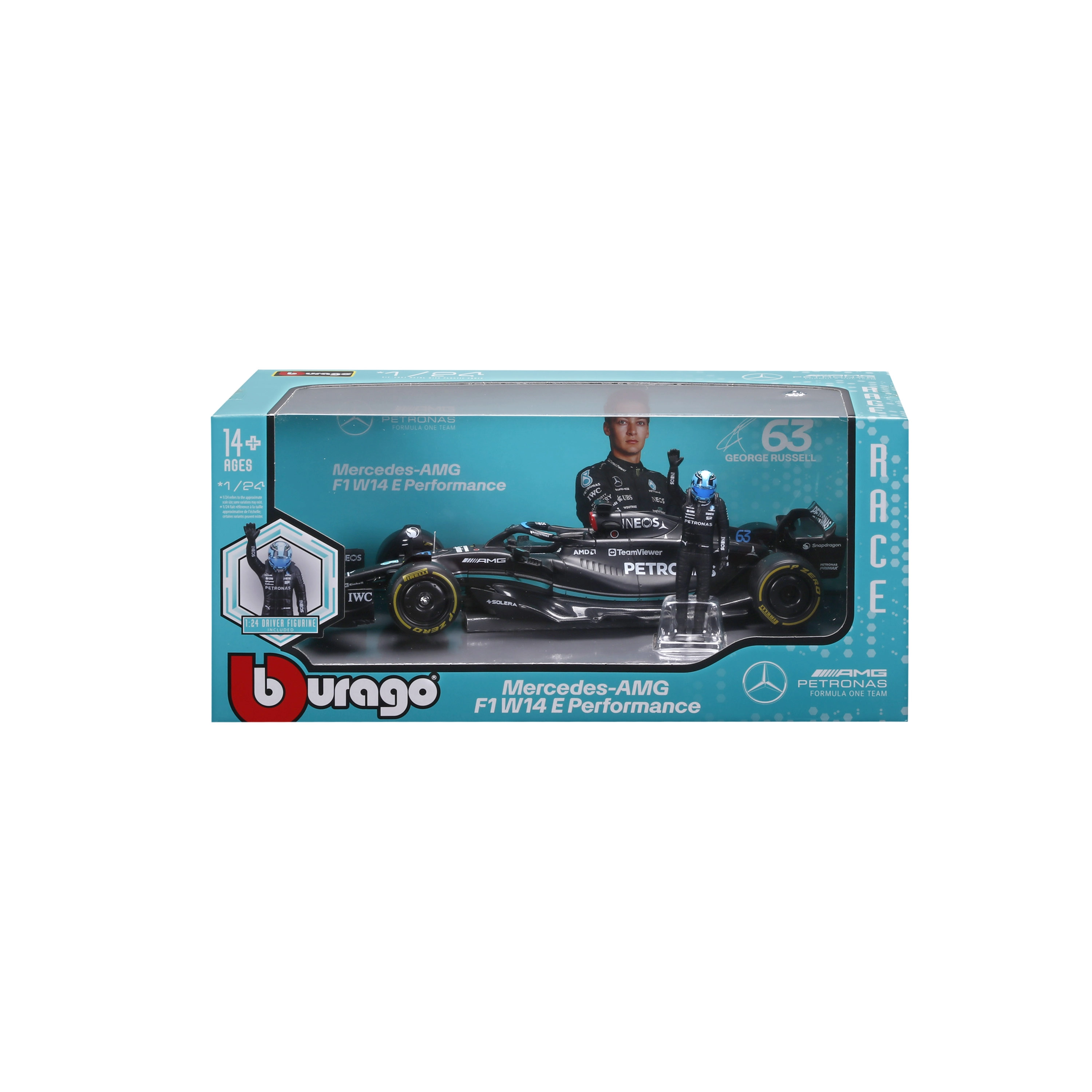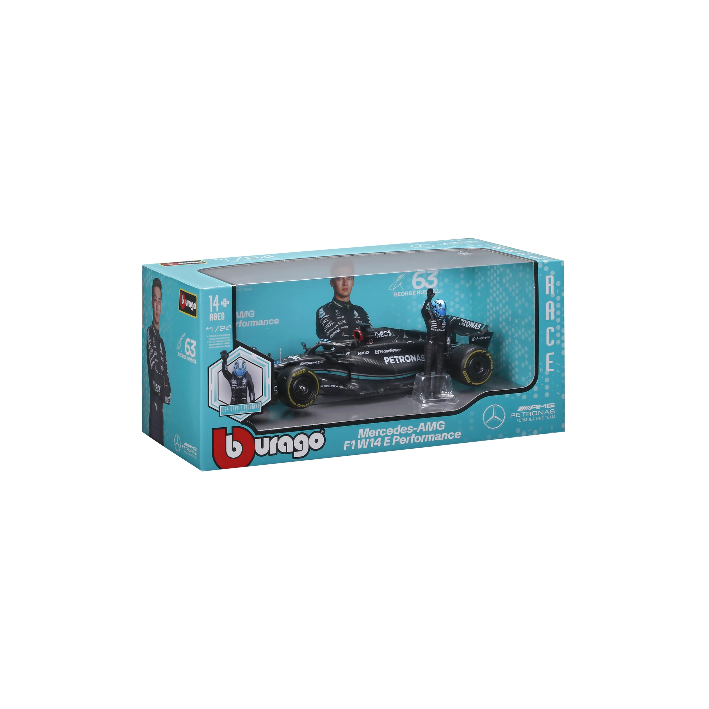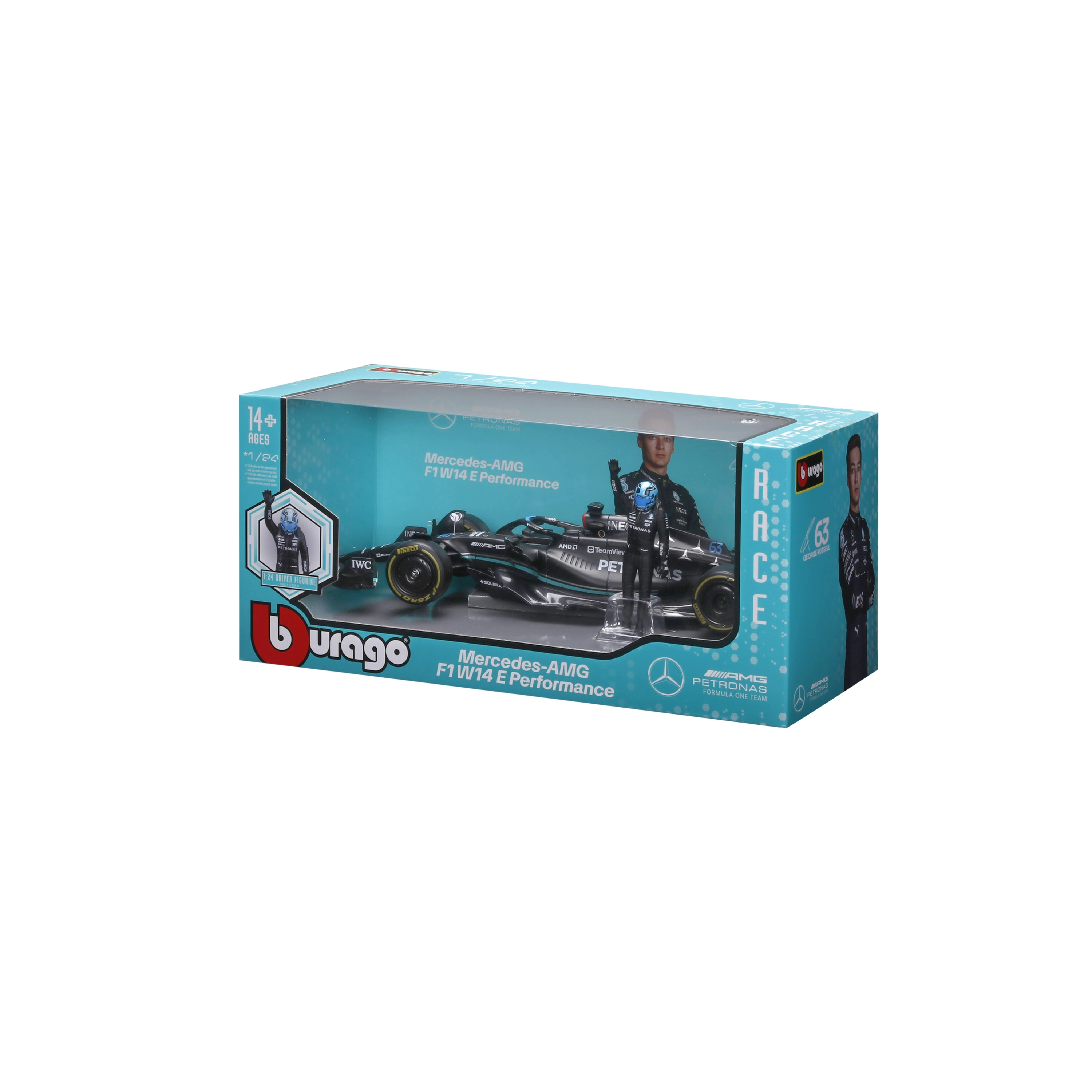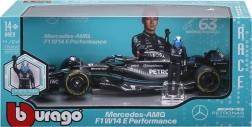 Detailní sběratelský model v měřítku 1:24 věrně zobrazuje vůz MERCEDES‑AMG F1 W14 E (2023) s číslem 63 pilota GEORGE RUSSELL. Model nabízí precizní potisk sponsorů, aerodynamické prvky, realistické pneumatiky a navíc figurku jezdce pro efektní vystavení.